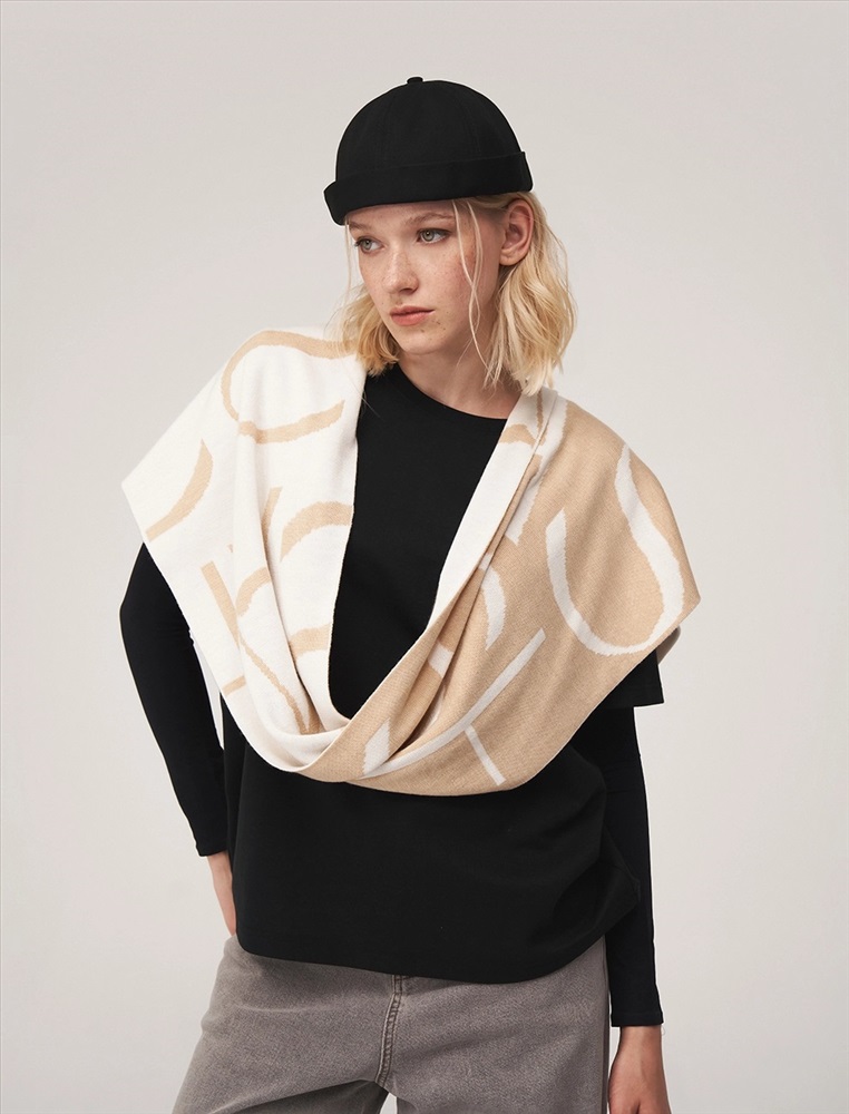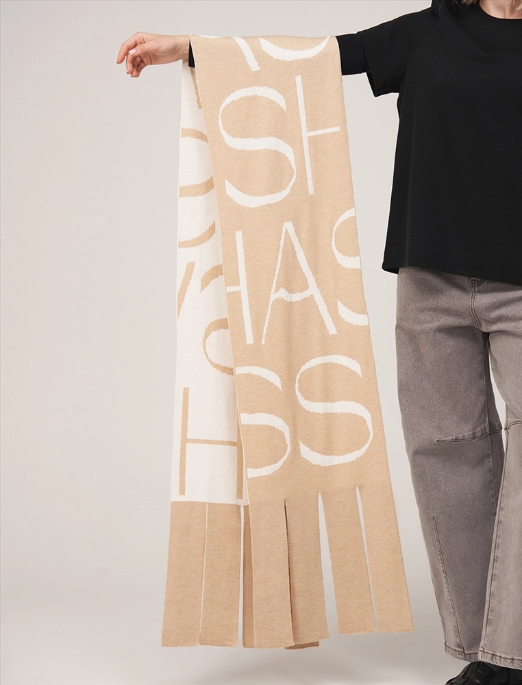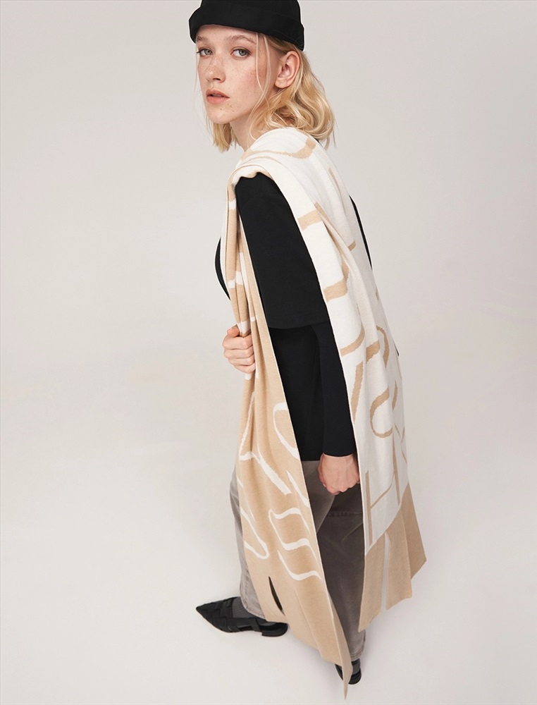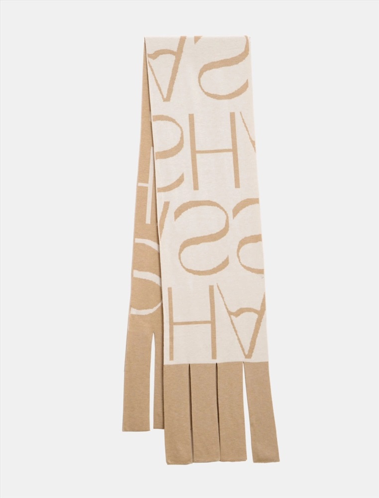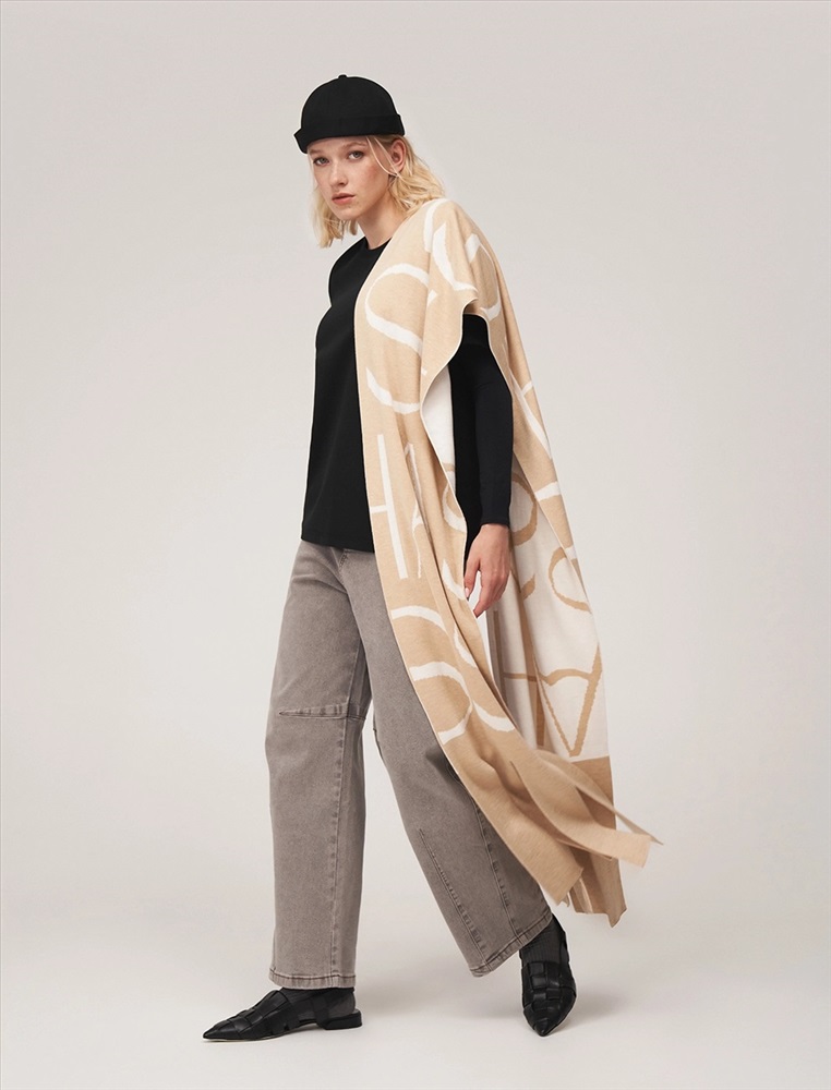 Широкий прямоугольный шарф-палантин с разрезами по низу и акцентным принтом HASS станет отличным дополнением к любому образу. В составе хлопок, акрил, шерсть и кашемир. Представлен в бежевом и синем цвете.