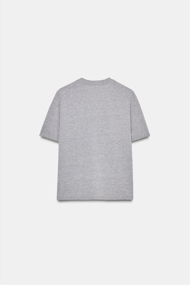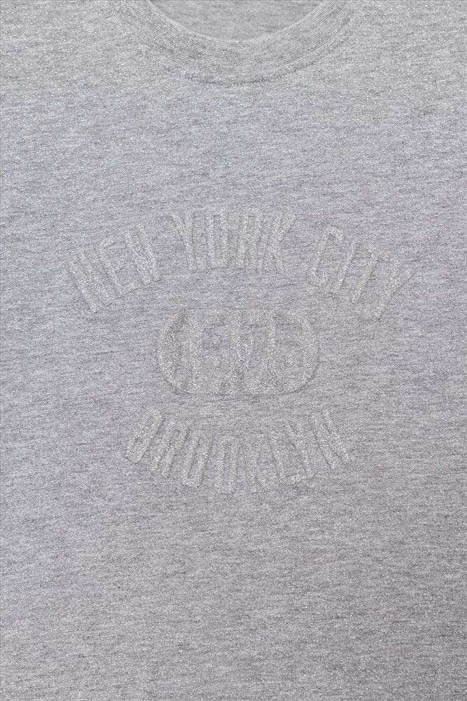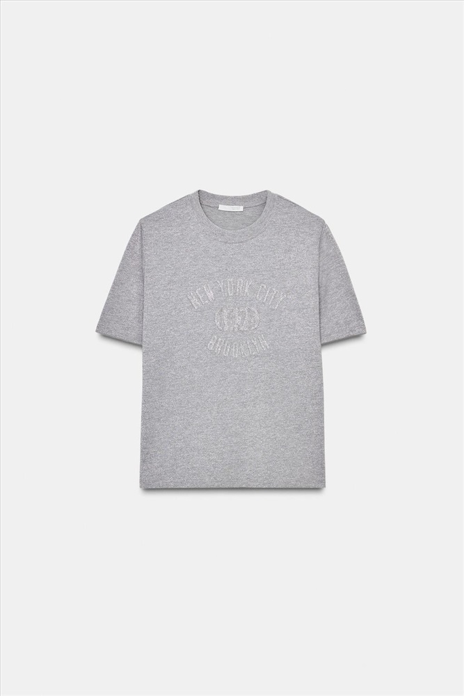 Round neck, short sleeve T-shirt. Featuring a text detail on the front and shimmery fabric.