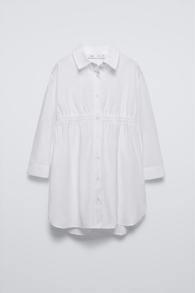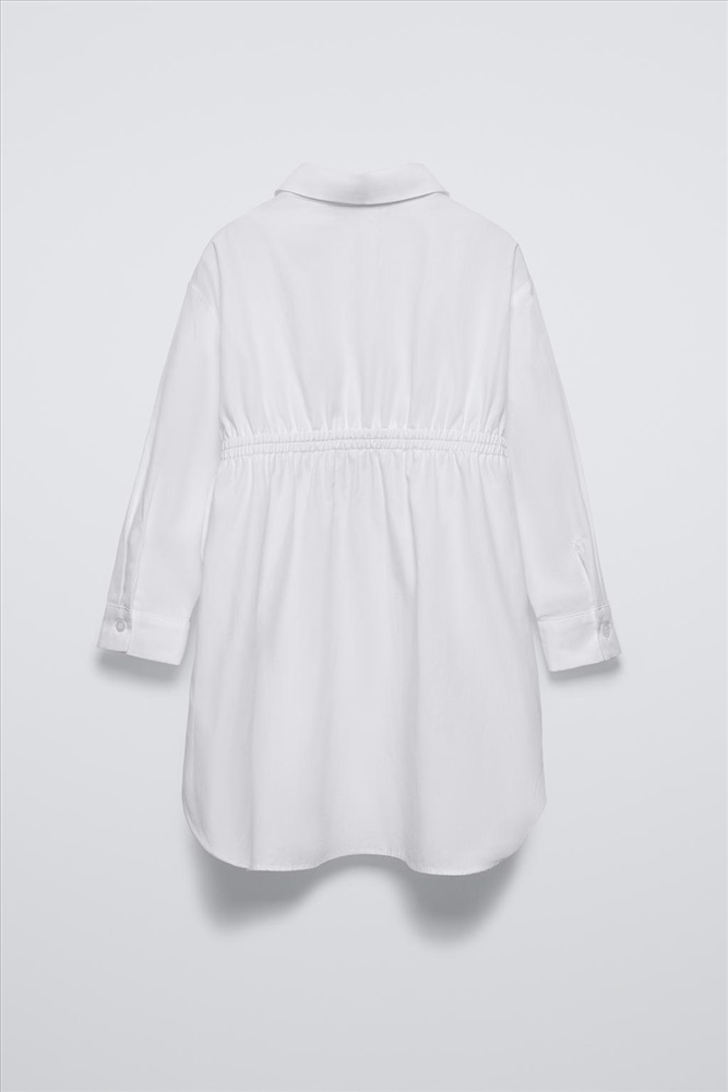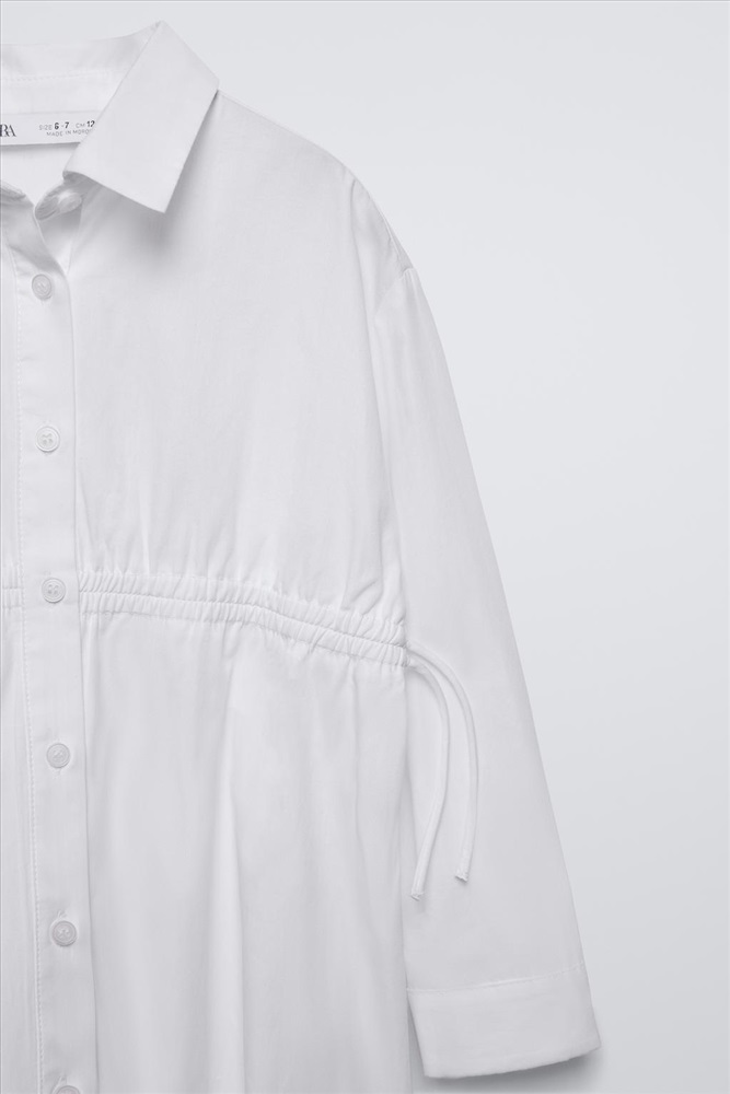 Shirt dress with long sleeves. Button-up front fastening. Elasticated waist with bow appliqués.