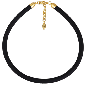 Изготовлено из ювелирного сплава на основе латуни с гальваническим покрытием золотом. Длина черного каучукового шнурка 45см. Замок-карабин с удлинителем 5см. Толщина 8мм.