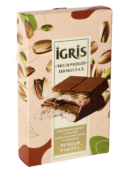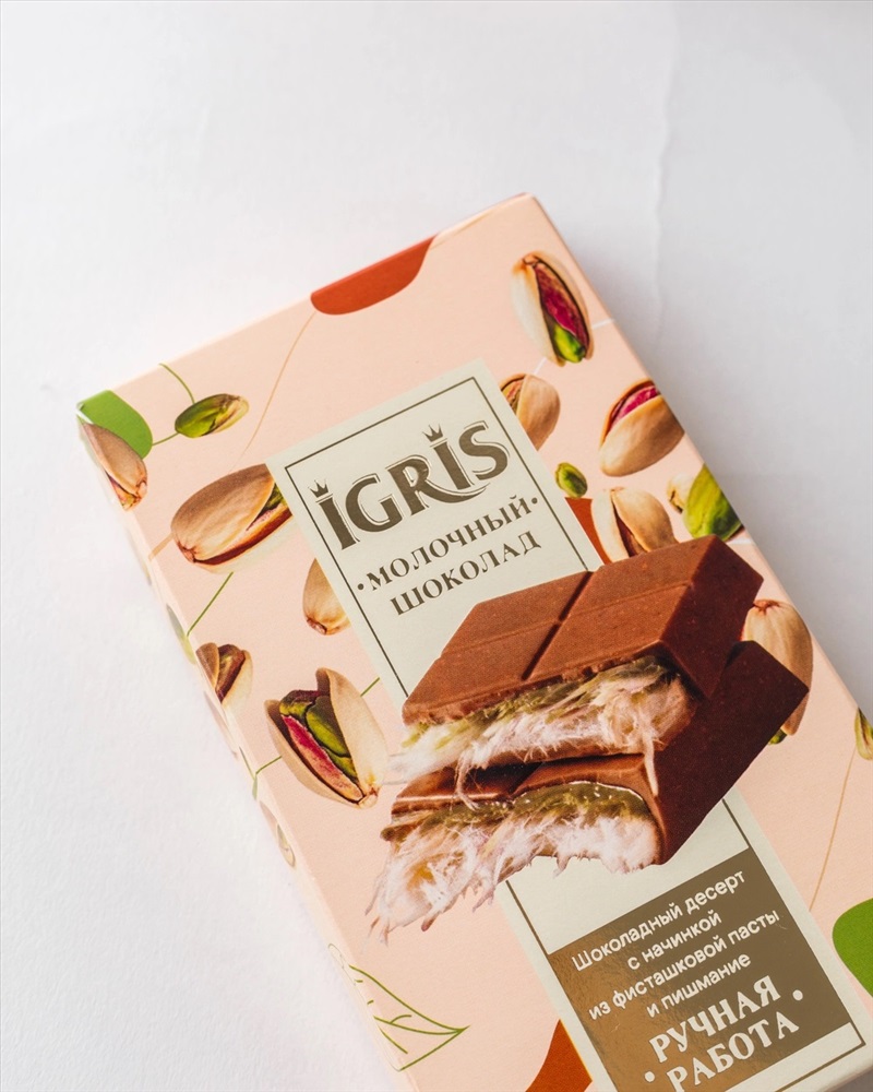 Коллекция плиток от IGRIS – это, безусловно, тренд, который не оставит равнодушным никого. Нежное, как пушинка, облако из пишмание, паста из 100% обжаренных ядер фисташек придает нашему шоколаду настоящий вкус роскоши.