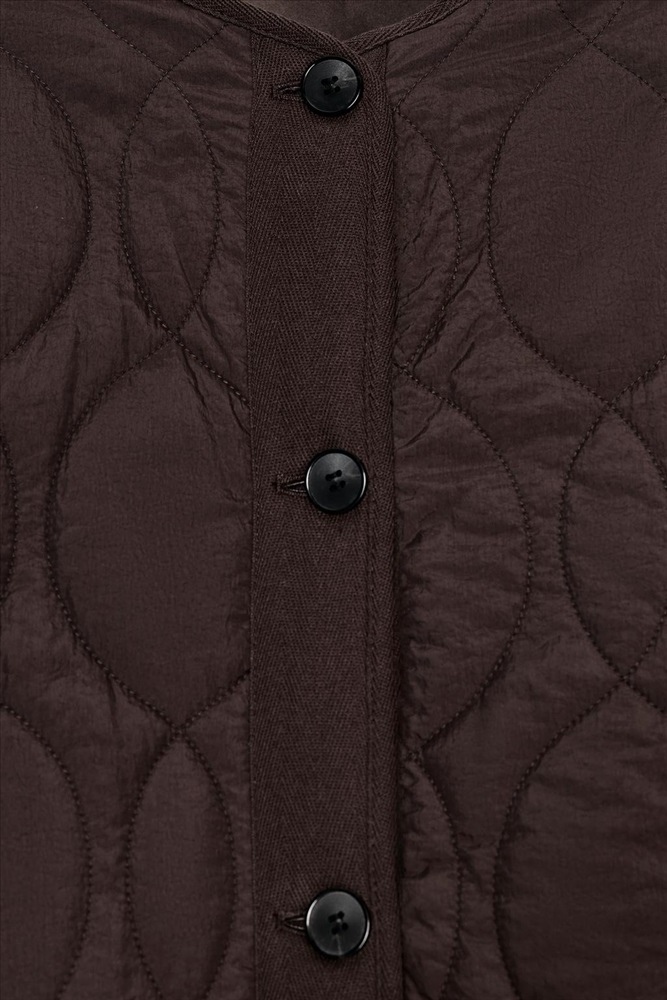 Padded jacket with a round neck and long sleeves. Featuring front welt pockets and a button-up front.
