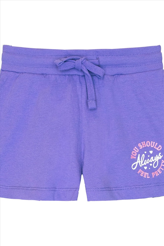 Страна производства: Россия Модные и удобные трикотажные шортики - отличный выбор для девочек на летний сезон и для занятий спортом. По поясу шорт вставлен плоский утягивающий шнурок в цвет шорт, низ шнурка подвернут и застрочен. На левой передней половинке шорт принт шелкография с глиттером. Надпись переводится как Ты всегда должна чувствовать себя красивой. Эти шортики для девочек идеально подходят для повседневных летних прогулок.