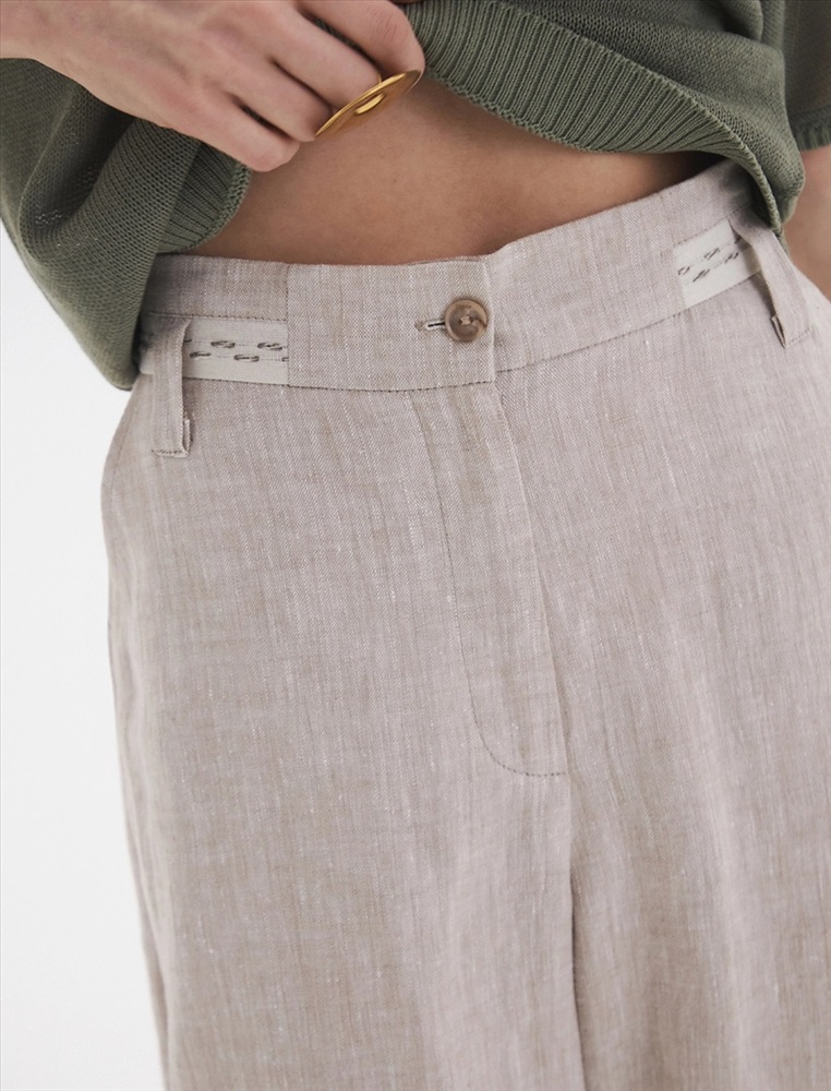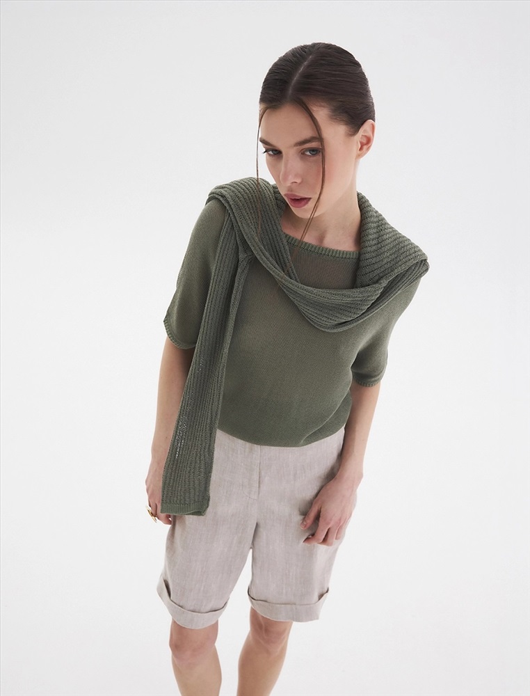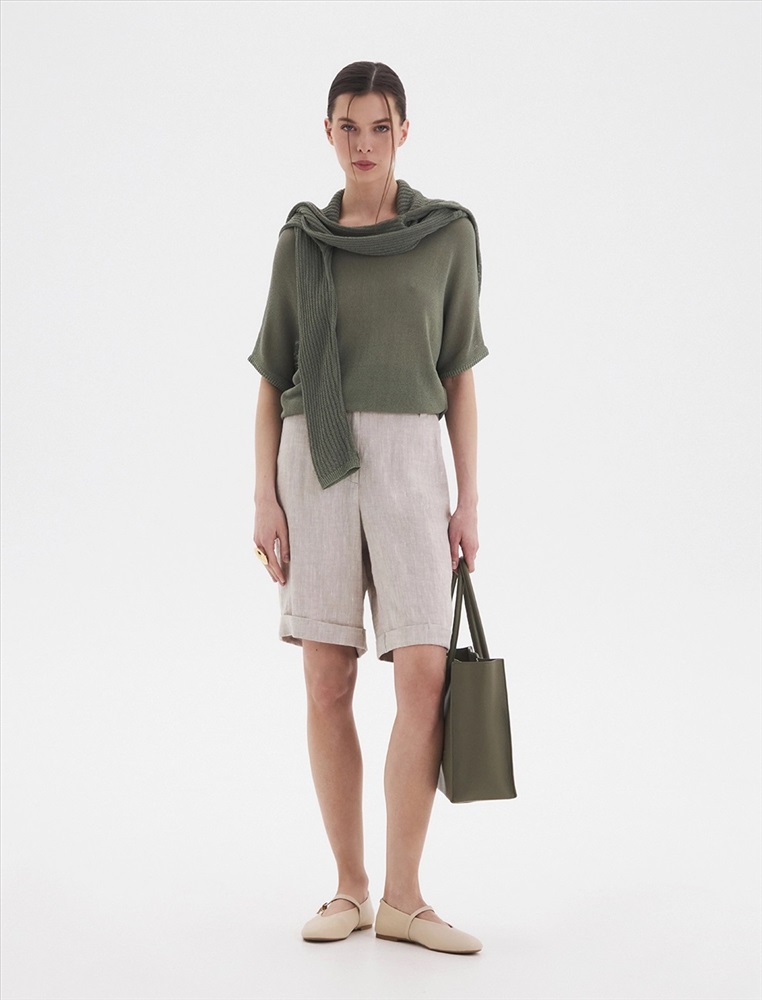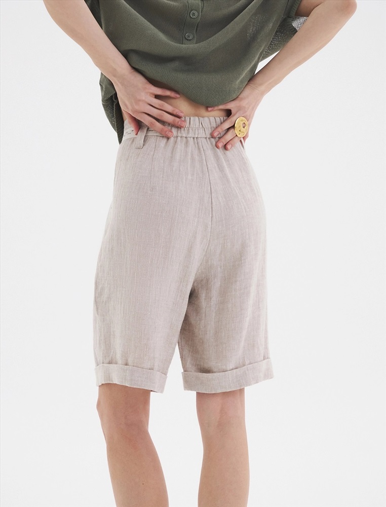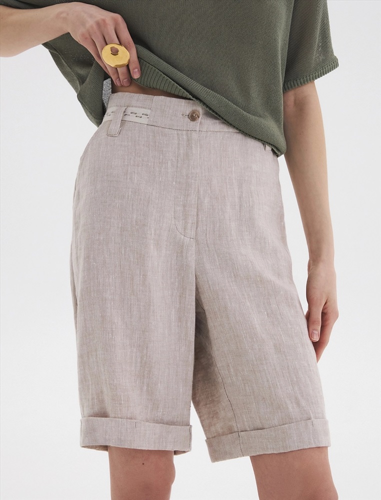 Видео: https-//hassfashion.ru/upload/iblock/4d4/fmg0ab6704owmj8953akvais6ts7ezlo.mp4 весна-лето А:100% Лен В: 80% Лен, 20% Хлопок Шорты из 100% льна прямого силуэта высокой посадки. Акцентом изделия является вставка из ткани с декором на поясе и шлевками. Спереди классическая застежка на молнию и пуговицу, а также боковые карманы. Низ обработан манжетами. Пояс на спинке имеет мягкую резинку, которая обеспечивает комфортную посадку, ниже расположены вытачки.