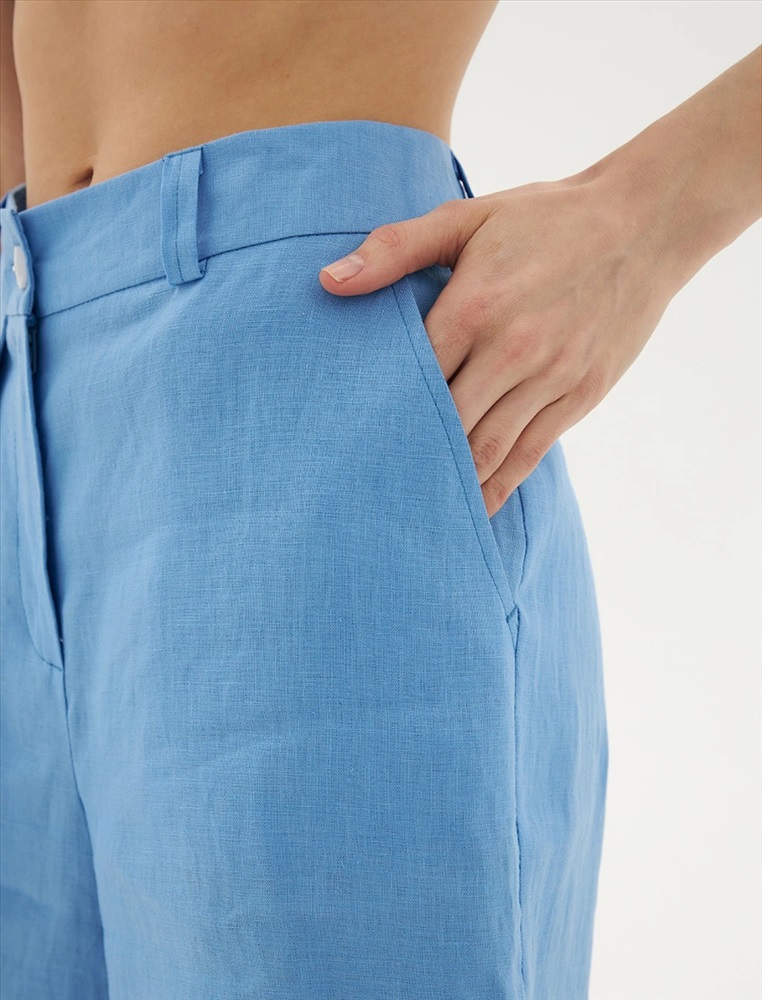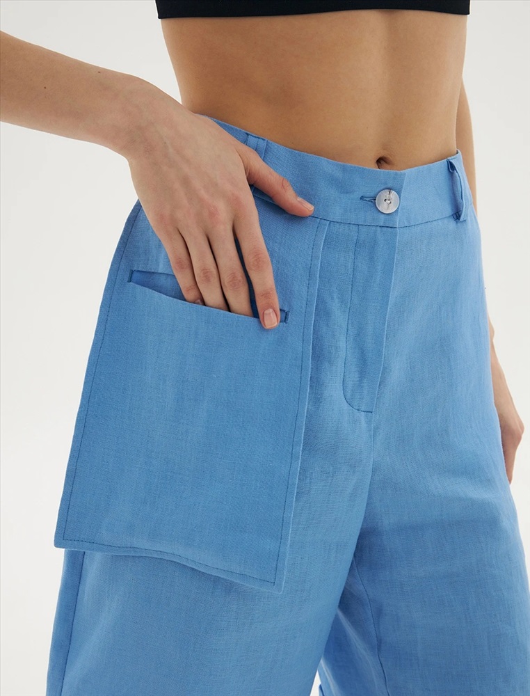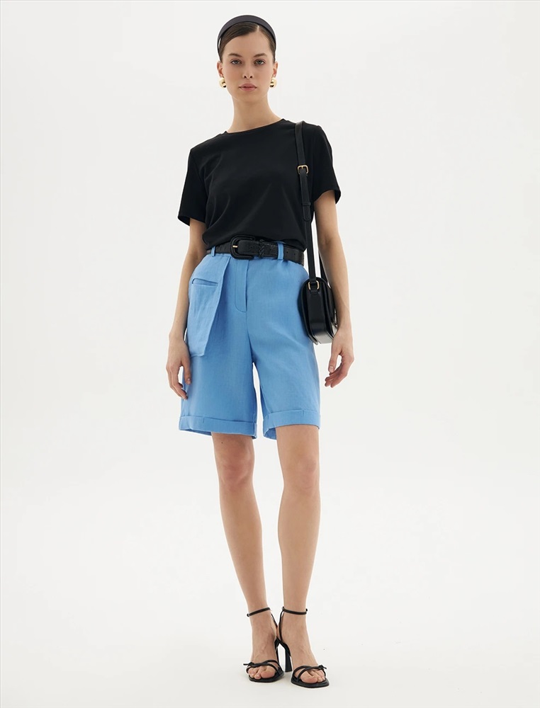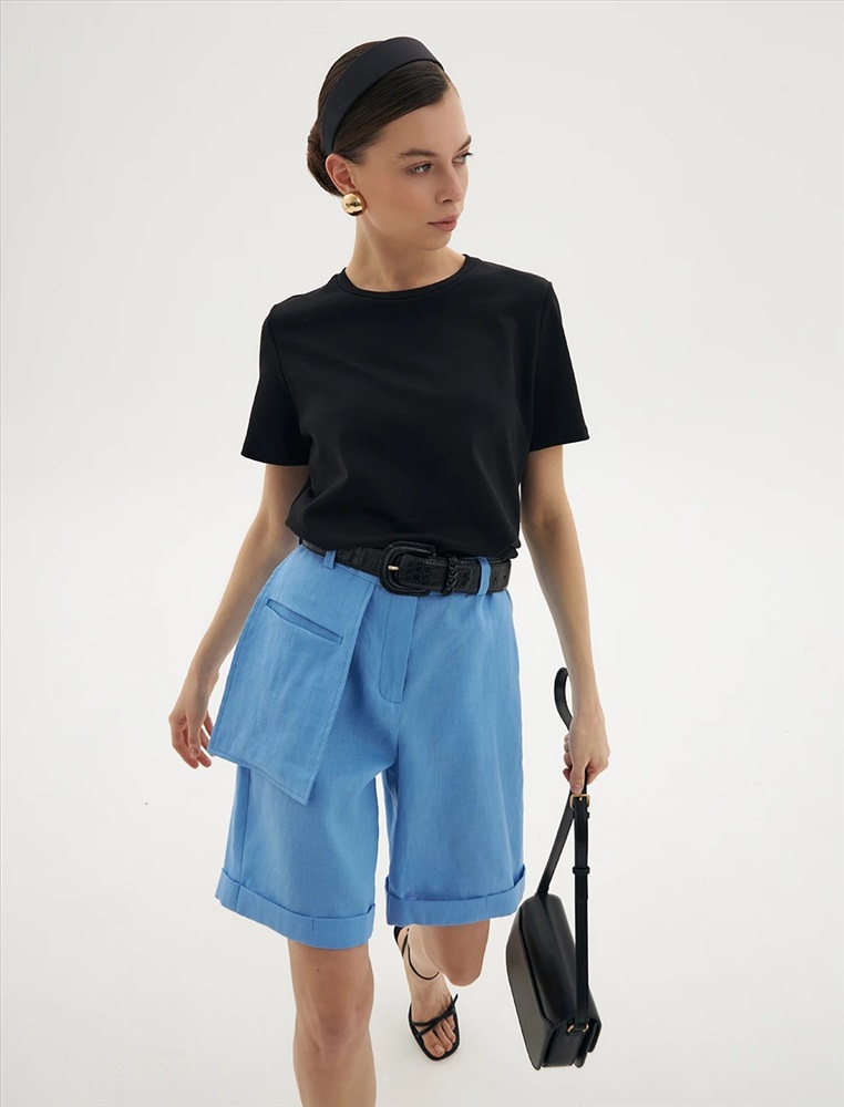 Шорты прямого силуэта высокой посадки. Акцентом изделия является подвесной карман с правой стороны. Классическая застежка на молнию и пуговицу. На спинке пояса расположена мягкая резинка, регулирующая посадку. Низ модели обработан манжетами.