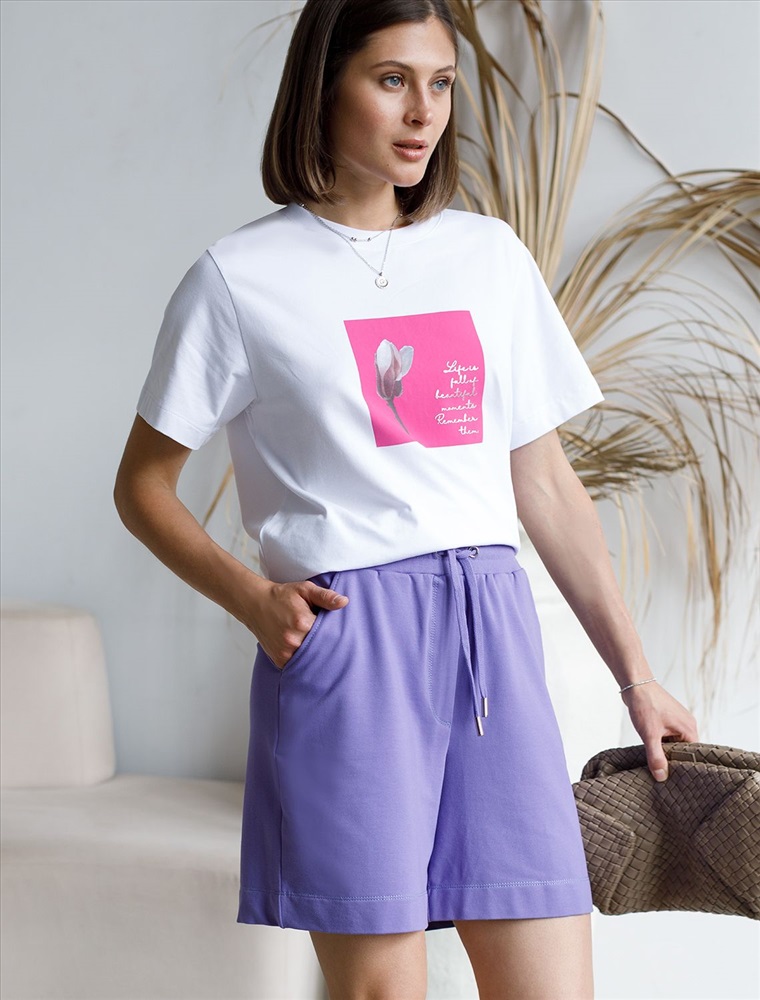 Плотность: 240 Г/м2 Параметры модели на первом фото: Рост 172, бюст 88, талия 64, бедра 88 Шорты выполнены из футера двухнитки с эластаном. Модель прямого кроя дополнена боковыми карманами и одним задним карманом. Пояс выполнен из эластичного трикотажа в рубчик. В пояс вставлен плоский хлопковый шнур в тон изделия с серебристыми наконечниками. Изделие дополнено металлическим логотипом бренда. Сочетается в костюме с жакетом D49.078, джемпером D49.079, D49.080 и футболкой D49.081 Комментарии к товару