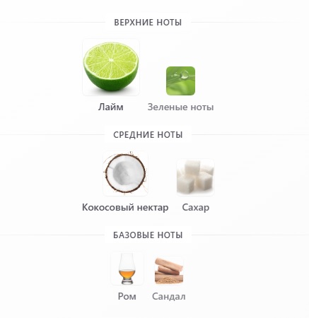 Верхние ноты: Лайм и Зеленые ноты; средние ноты: Кокосовый нектар и Сахар; базовые ноты: Ром и Сандал.