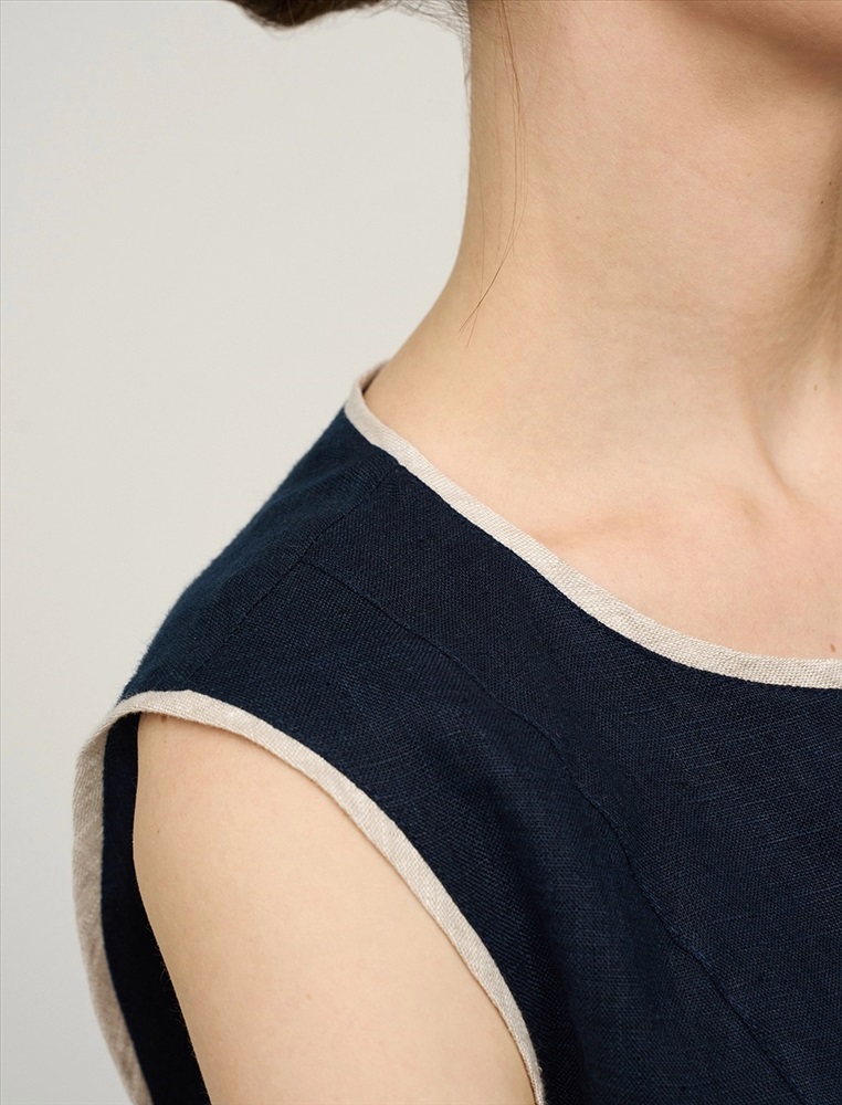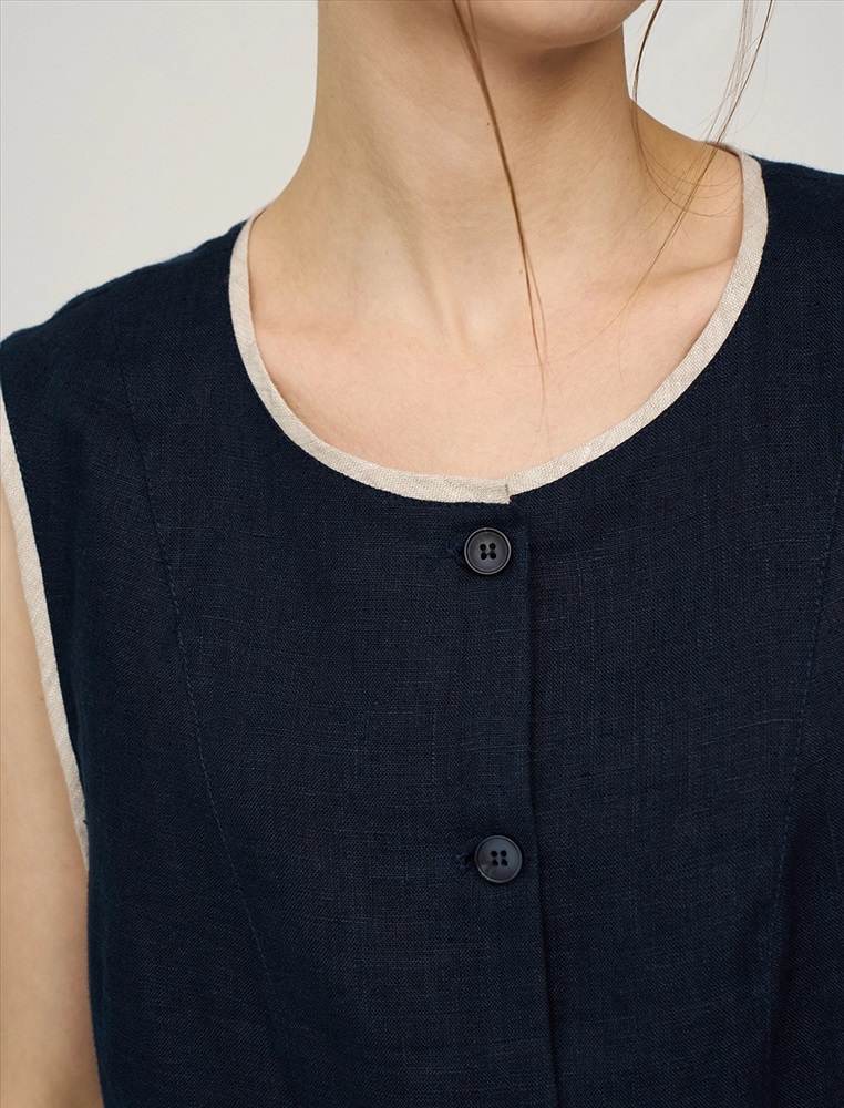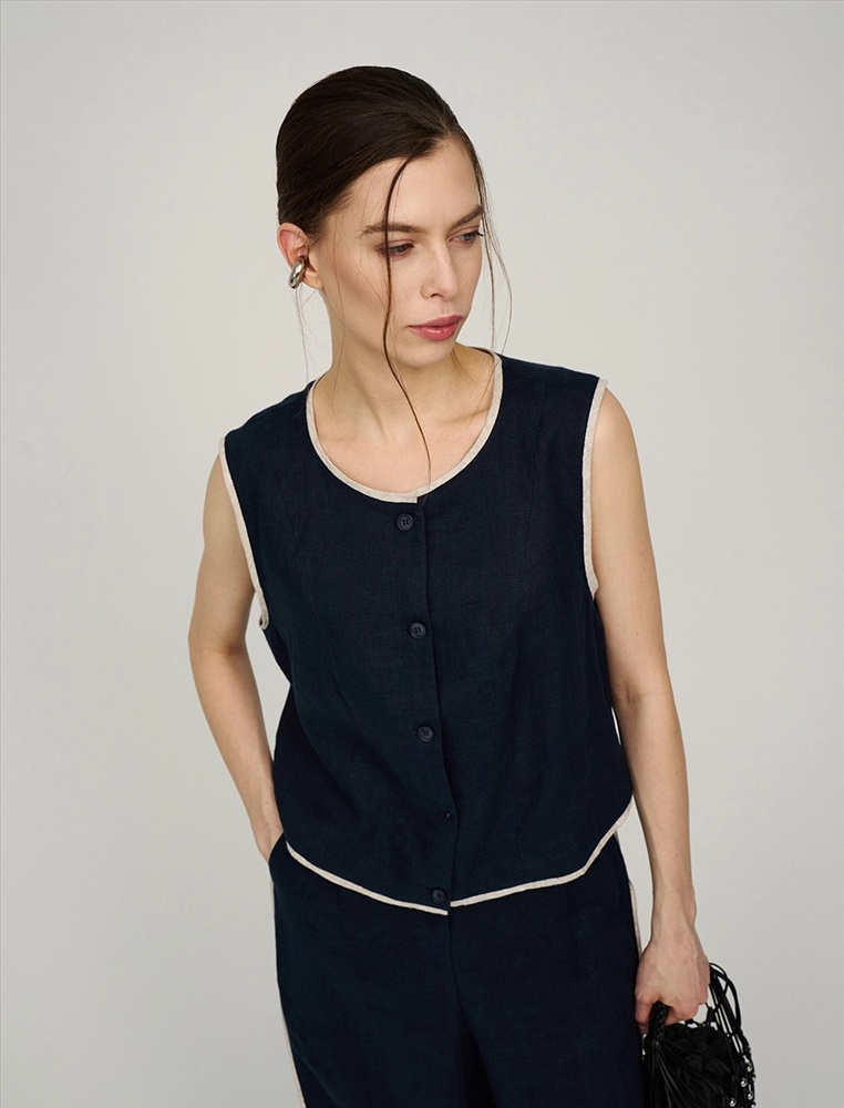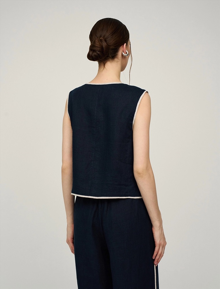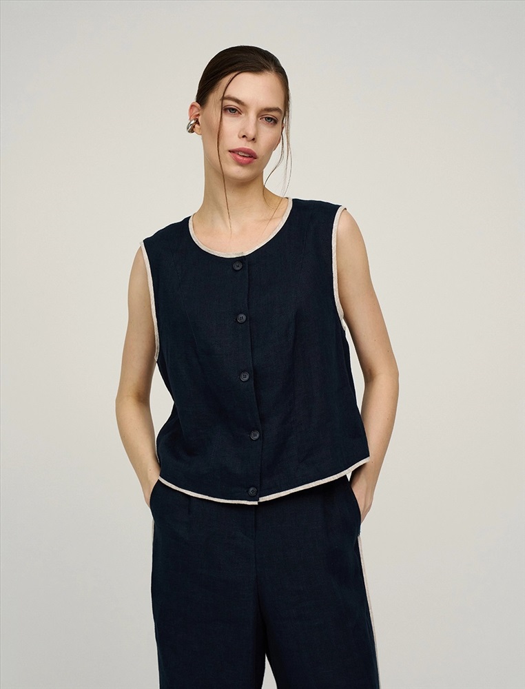 Жилет прямого силуэта без рукавов. По передней части изделия - застежка на пуговицы. По горловине, пройме и низу - контрастный кант. В составе ткани натуральный, дышащий 100% лен. Представлен в двух цветах - синий и бежевый.