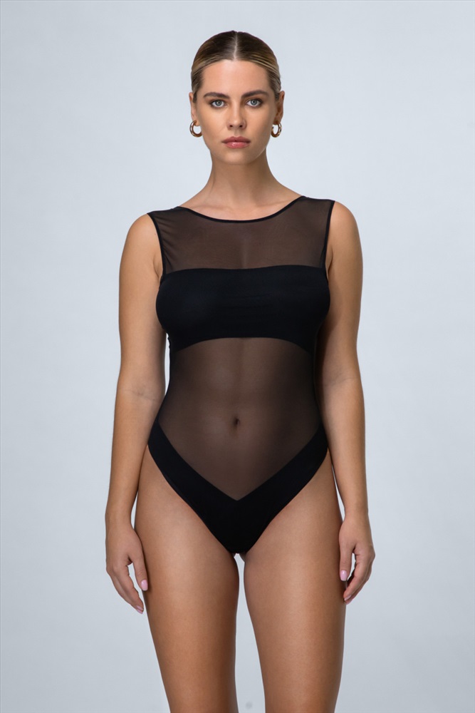 Состав: полиамид 80%, эластан 20% Боди The Icon выполнено из эластичной нежной сетки, спереди на груди и на ягодицах продублировано эластичной черной тканью, ластовица из 100% хлопка, застежка на двух металлических кнопках.