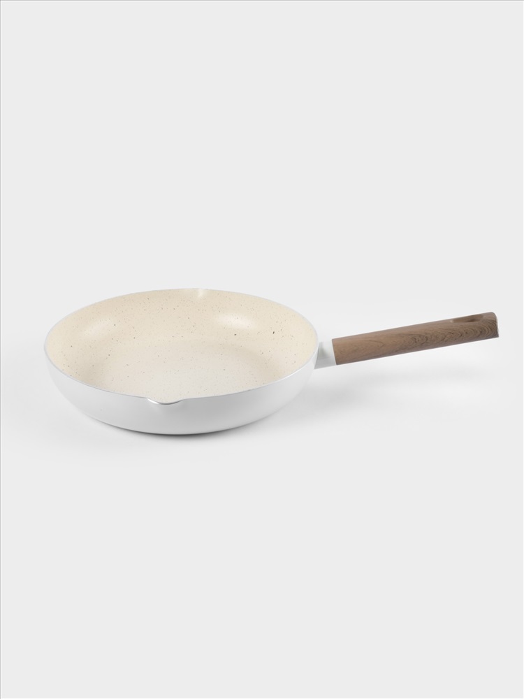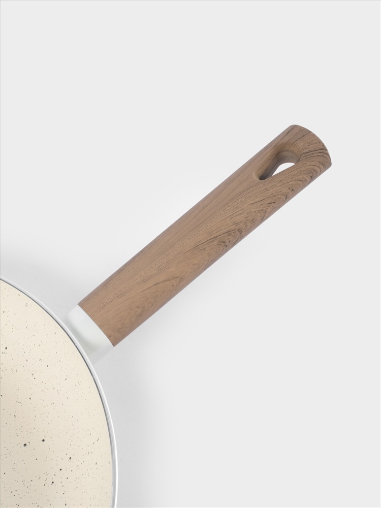 Сковорода. Размер: 28 см. Материал: прессованный алюминий с двухслойным антипригарным мраморным покрытием Pfluon, ручка - бакелит, нержавеющая сталь. Двухслойное антипригарное покрытие Pfluon marble безопасно для здоровья, т.к. не содержит PFOA (перфтороктановая и перфлюорооктановая кислоты); имеет гладкую поверхность, которая позволяет готовить с минимальным количеством масла и выдерживает нагрев до 260ºС; обладает высокой теплопроводностью, износостойкостью и устойчивостью к царапинам. Подходит для всех типов плит, в том числе индукционных. Пустую посуду не подвергать воздействию высоких температур. Рекомендации по уходу: мыть вручную с применением мягких моющих средств. Не использовать для ухода абразивные чистящие средства и жесткие губки. Можно мыть в посудомоечной машине, но это приводит к появлению темного налета на внешней алюминиевой части дна.