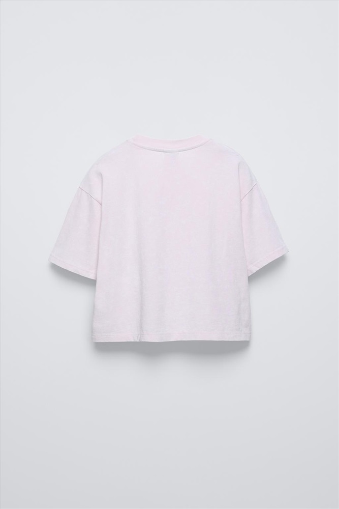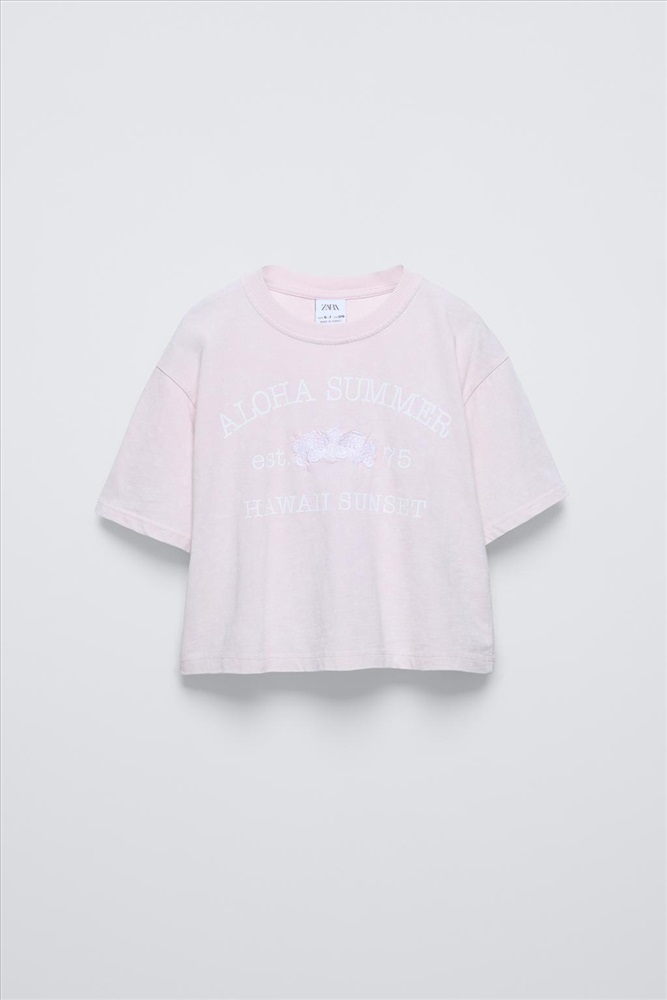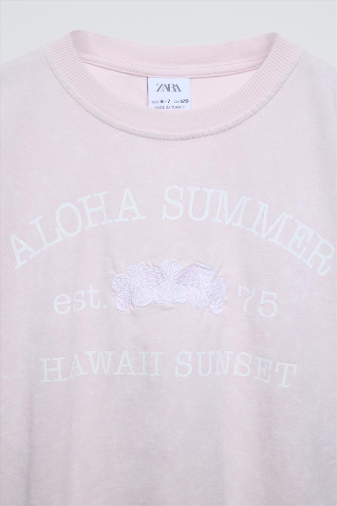 Round neck T-shirt with short sleeves. Featuring a slogan print with embroidered flower appliqué on the front.