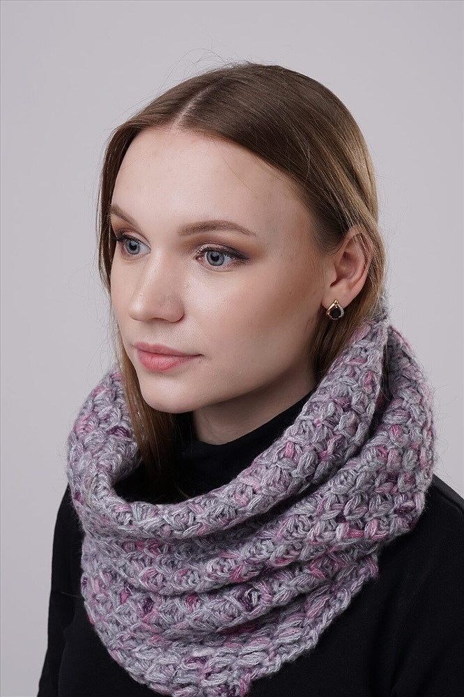 ID товара: 243874 Состав: 62% Акрил, 27% Полиэстер, 11% Мохер Сезон: Осень/Зима Основная ткань: Акрил Страна бренда: Россия Страна производства: Россия Снуд-труба с фактурным переплетением из фасонной объемной пряжи с добавлением мохера. Комментарии к товару
