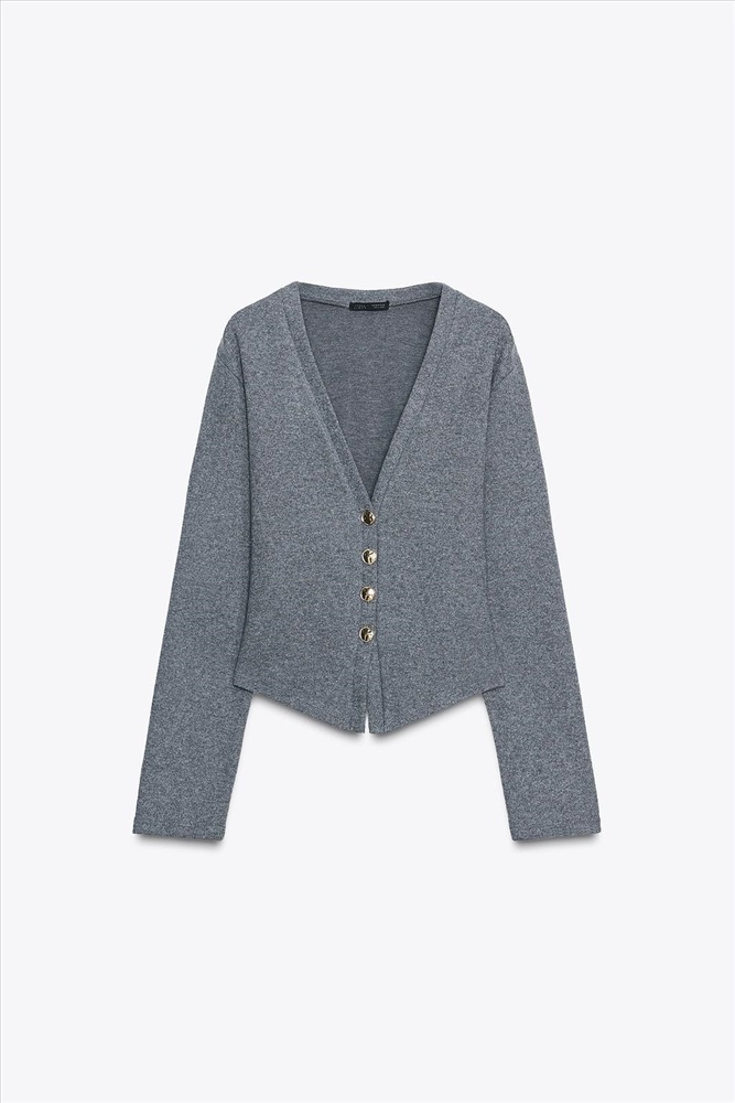 Cardigan crafted from cotton yarn. Featuring a V-neck and long sleeves. Front metal button fastening. COMPOSITION, CARE & ORIGIN COMPOSITION OUTER SHELL 55% polyester Which contains at least: OUTER SHELL 45% RCS certified recycled cotton 55% RCS certified recycled polyester CERTIFIED MATERIALS RCS CERTIFIED RECYCLED POLYESTER Nowadays, recycled polyester is mainly made from PET plastic waste. This is a type of plastic that is widely used in a variety of items, such as plastic bottles. Using recycled materials helps limit the production of virgin polyester fibre. It is certified to the Recycled Claim Standard (RCS), which verifies the recycled content and tracks it from source to final product. Certified by Intertek 193341 More information RCS CERTIFIED RECYCLED COTTON This fibre is made from recycled cotton textile waste. Using recycled materials helps limit the consumption of raw materials. It is certified to the Recycled Claim Standard (RCS), which verifies the recycled content and tracks it from source to final product. Certified by Intertek 193341 More information CARE Caring for your garments to extend their useful life. Lower temperature washes and delicate spin cycles are gentler on garments and help to protect the colour, shape and structure of the fabric.
