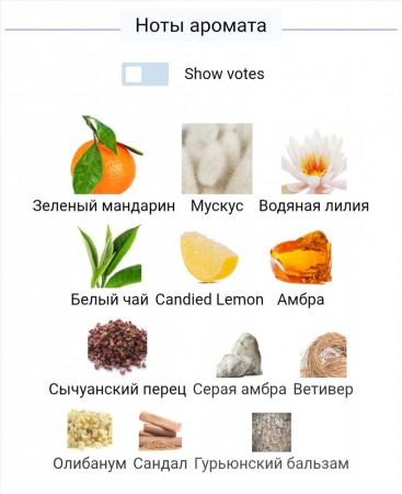 Композиция аромата:  сычуаньский перец, засахаренный лимон, зелёный мандарин, водяная лилия, ладан, белый чай, мускус, амбра, сандал, гурьюнский бальзам, ветивер, золотая амбра