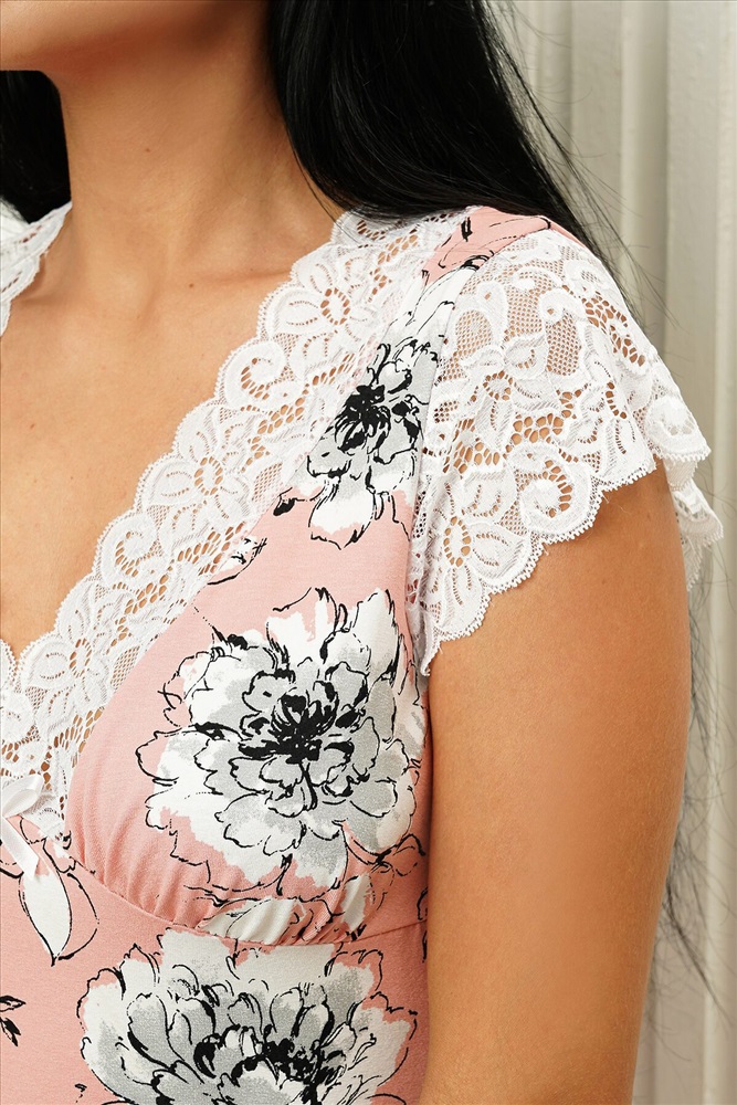 Сорочка из вискозы, с коротким рукавом из эластичного мягкого кружева, лиф также декорирован кружевом и бантиком из атласной ленты. Сорочка полуприлегающего силуэта, длиной выше колена.