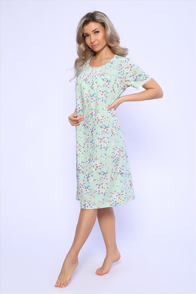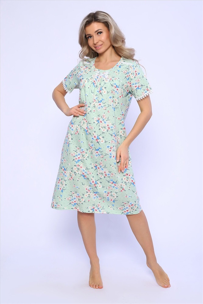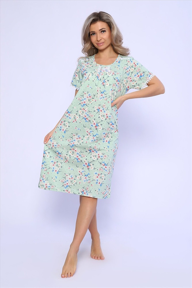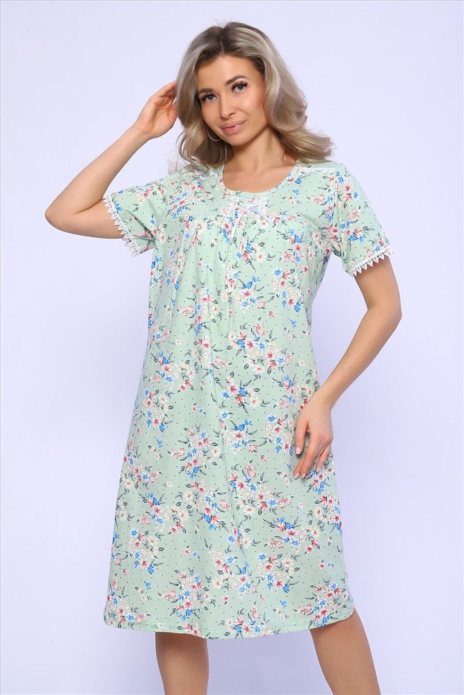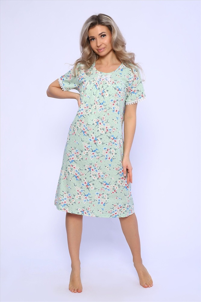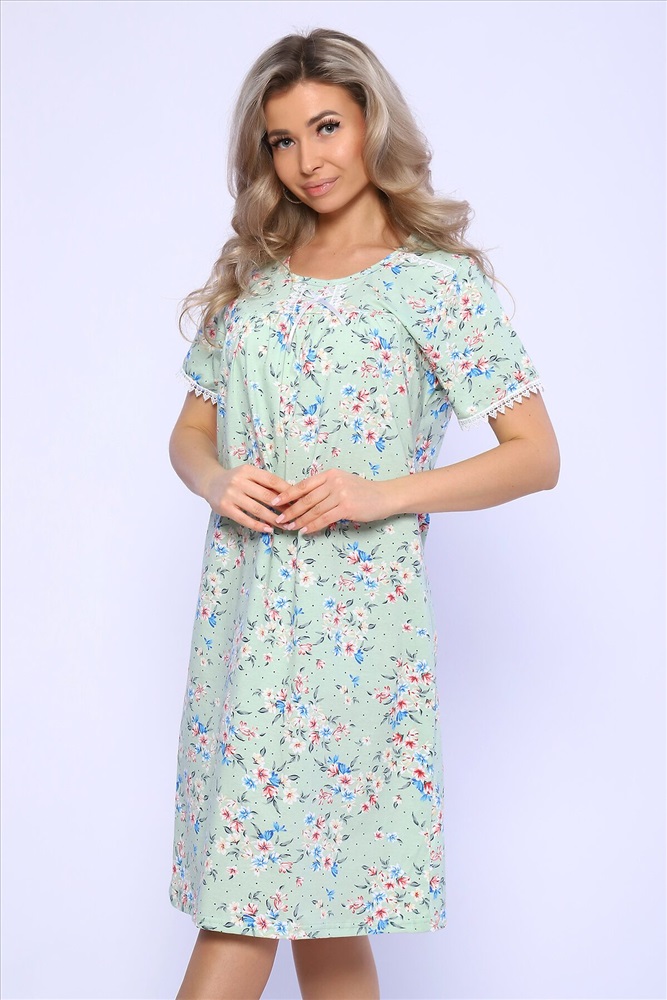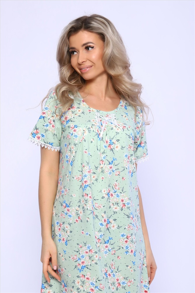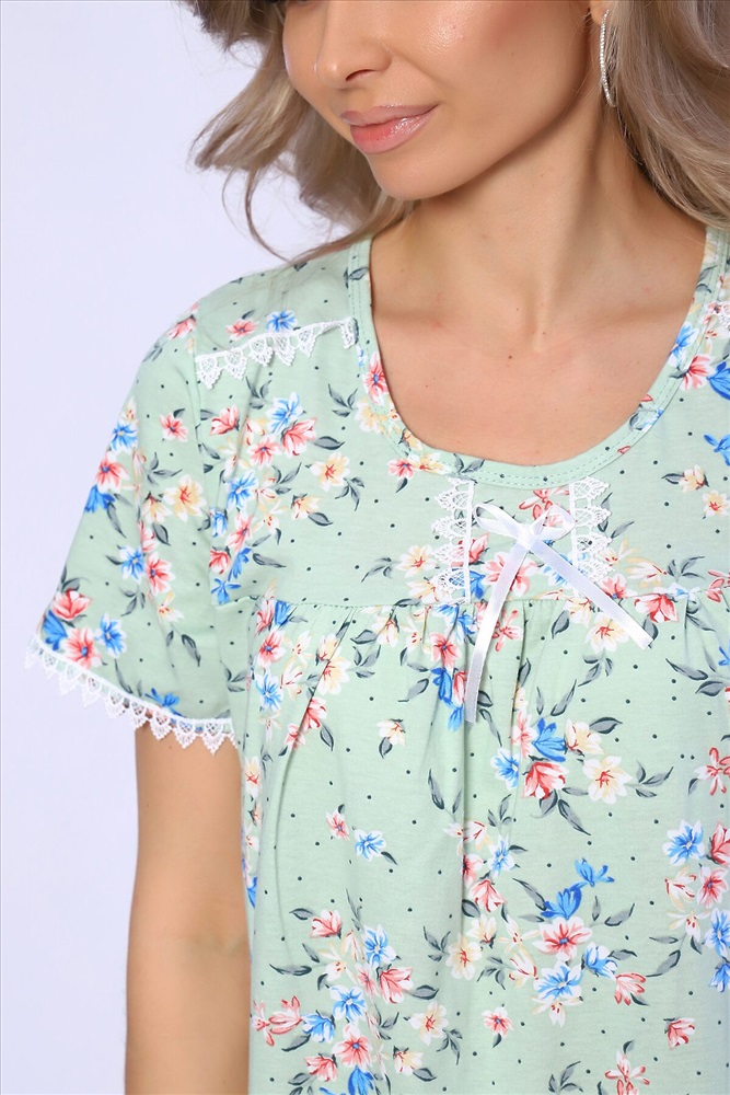Страна производства: Россия Сорочка свободного кроя с короткими рукавами. Полочка с отрезной кокеткой и сборкой над грудью. Рукава и кокетка украшены кружевом и атласным бантиком.