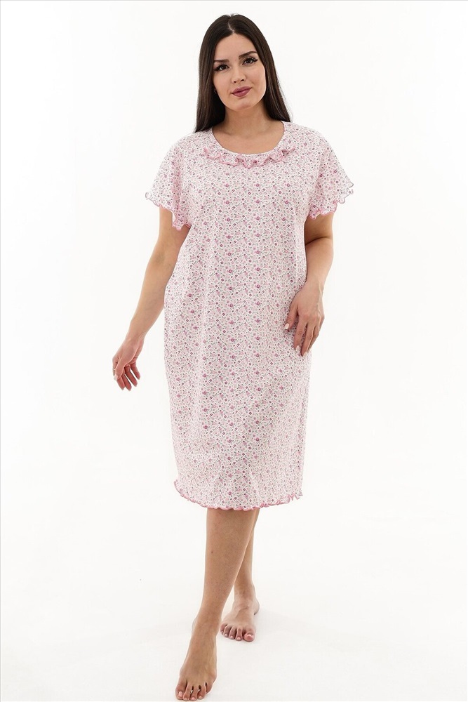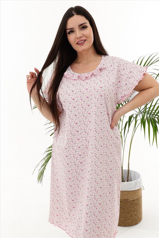 Страна производства: Россия Сорочка женская с симпатичной рюшей по горловине. Очень свободный и удобный крой. Рукав-реглан не стесняет движения рук. Обработка рукава и низа изделия в виде лёгкой волны придаёт лёгкость и воздушность.