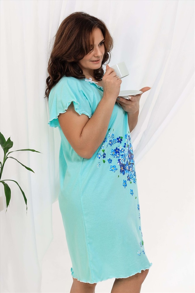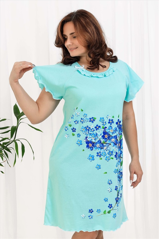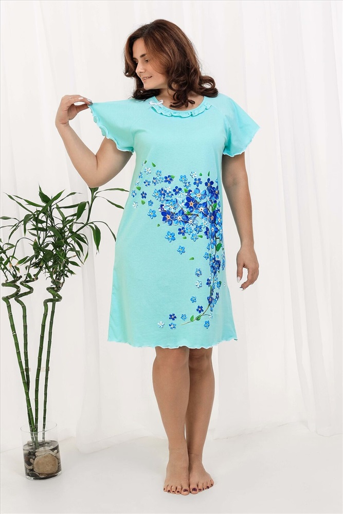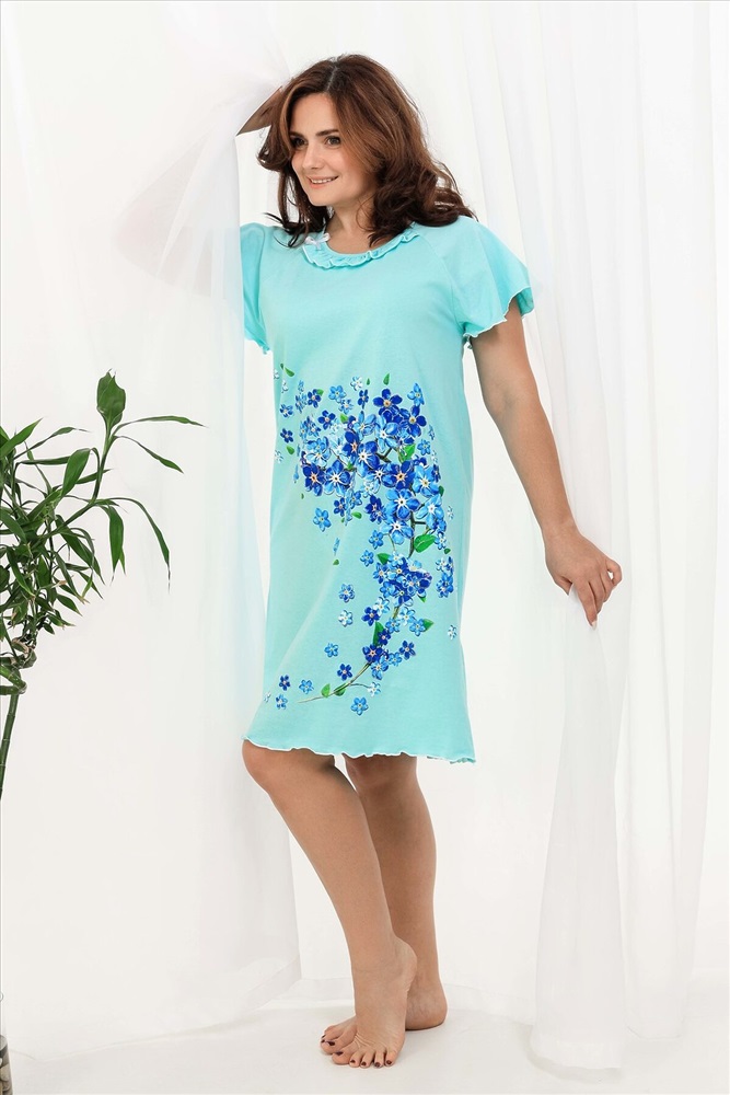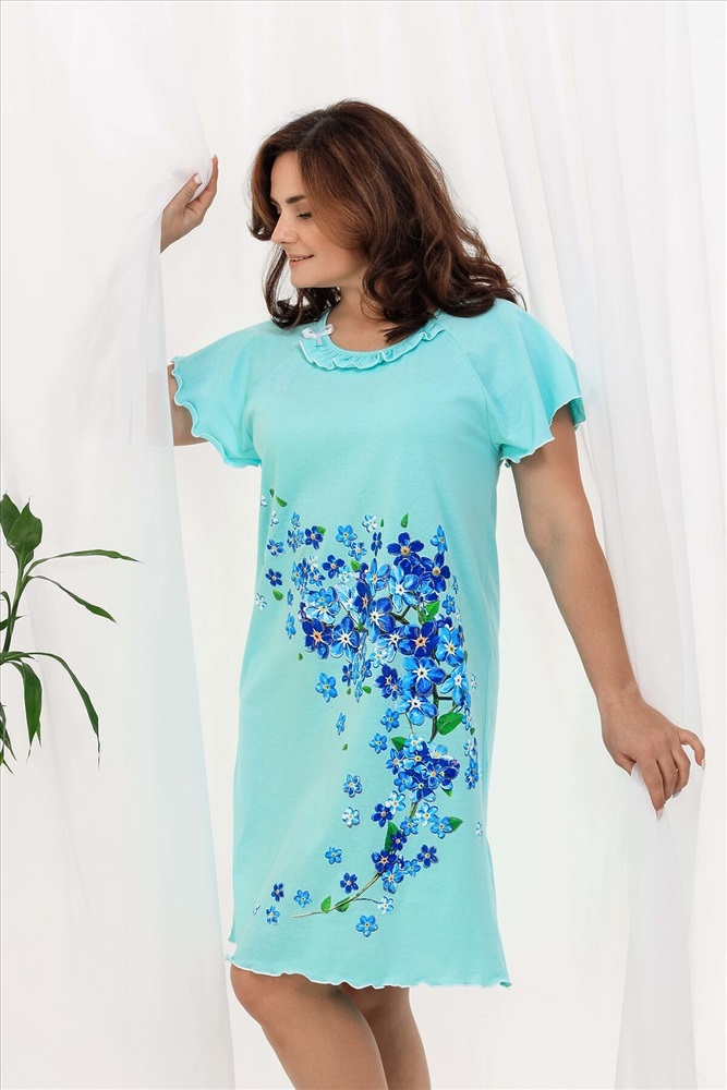 ID товара: 820263 Состав: Хлопок 100% Сезон: Демисезон Длина: До колена Фасон: Свободный крой Рукав: Короткие Декоративные элементы: Принт Основная ткань: Хлопок | Кулирка Стиль: Повседневный Страна бренда: Россия Страна производства: Россия Сорочка женская с симпатичной рюшей по горловине. Очень свободный и удобный крой. Рукав - реглан не стесняет движения рук. Обработка рукава и низа изделия в виде лёгкой волны придаёт лёгкость и воздушность. Шикарный принт в виде россыпи незабудок. Комментарии к товару