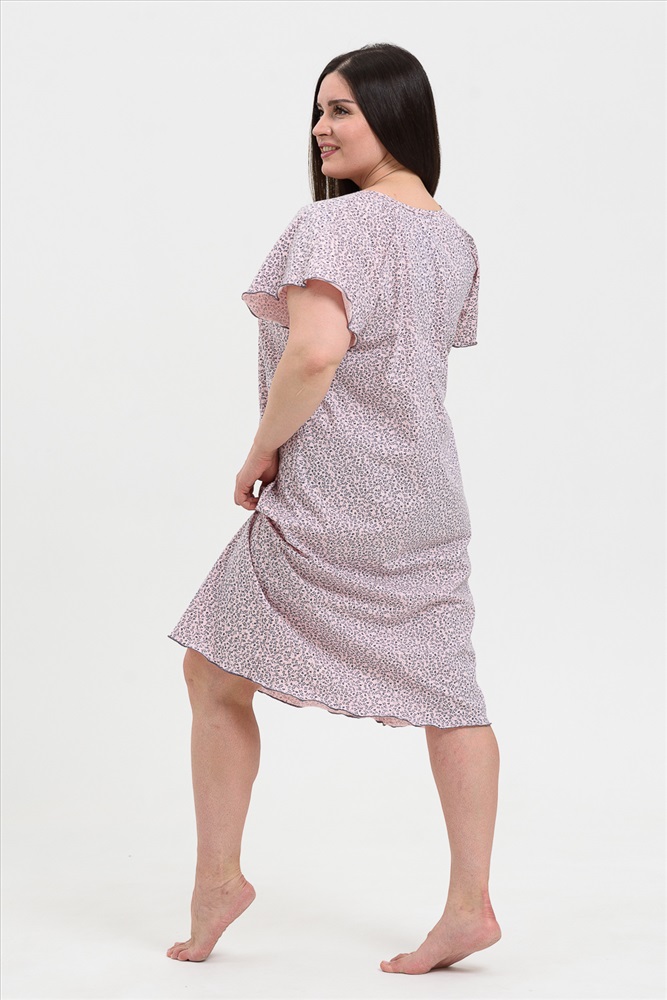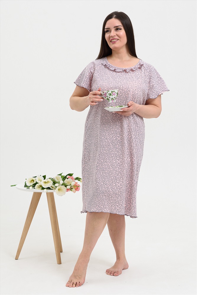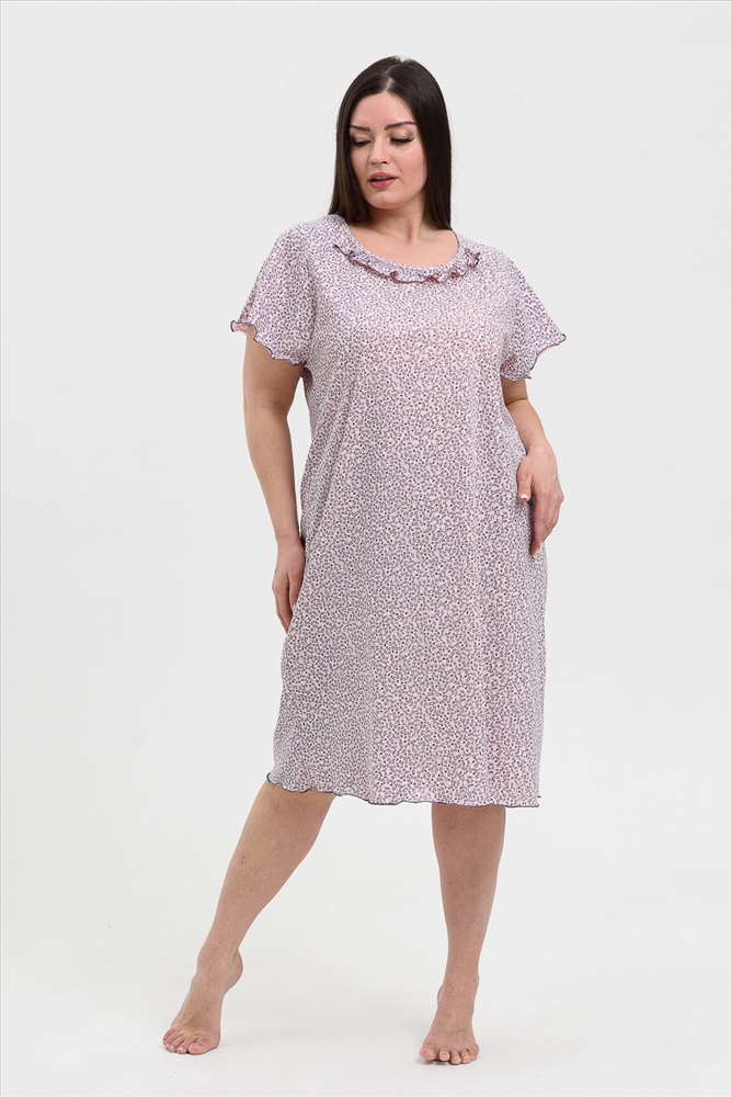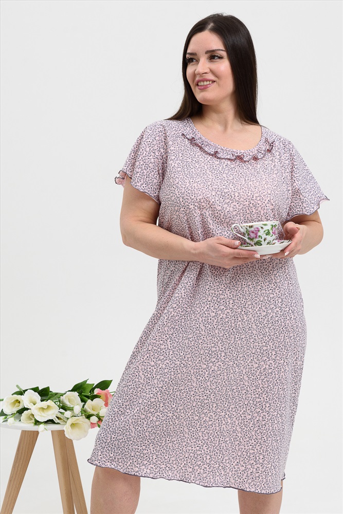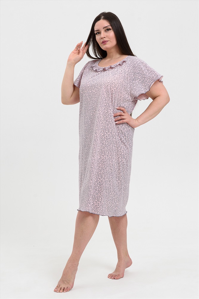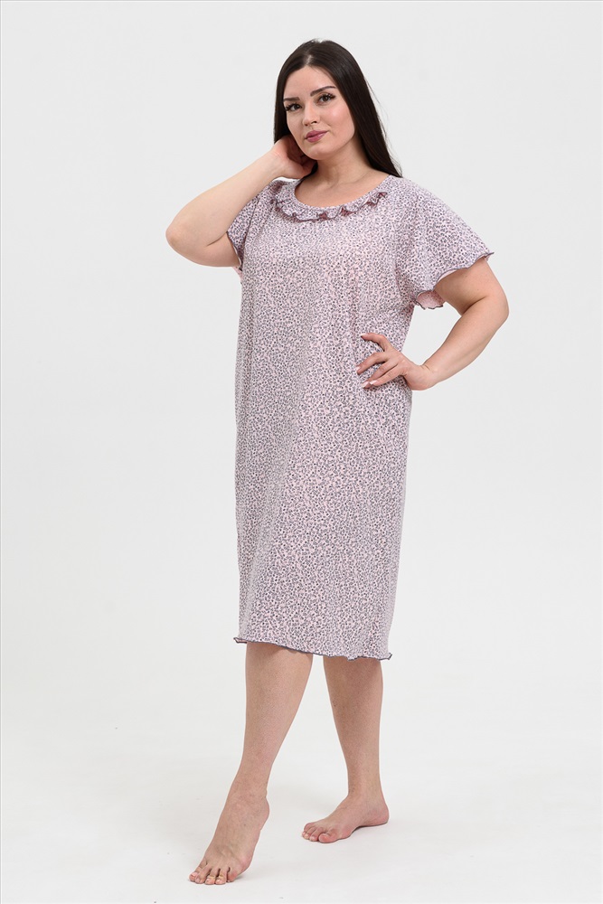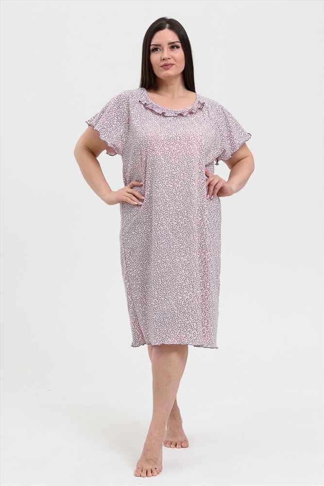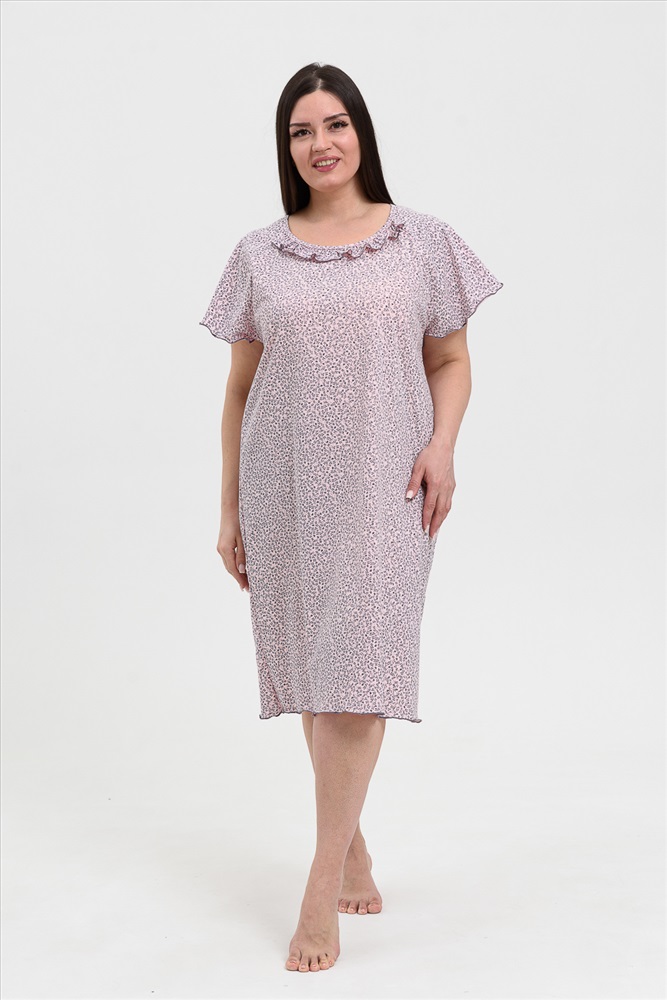 Состав: Хлопок 100%. Модель: Сорочка №21605 Тип товара: сорочка Материал: кулирка | кулирка Бренд: Натали Суслова Длина: средняя длина Назначение: для дома НДС: 5% Рисунок: крапинка Рукав: короткий рукав Сезонность: лето | осень | весна | зима Силуэт: свободный Стиль: домашний Сорочка женская больших размеров с симпатичной рюшей по горловине. Очень свободный и удобный крой. Рукав-реглан, не стесняет движения рук. Обработка рукава и низа изделия в виде лёгкой волны придаёт лёгкость и воздушность. Таблица размеров и веса