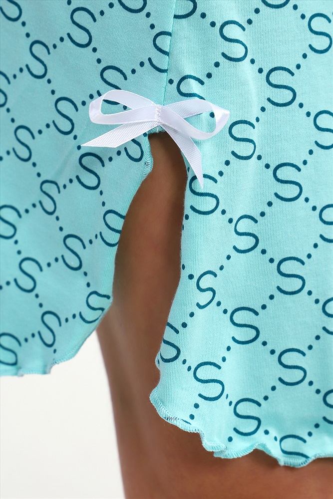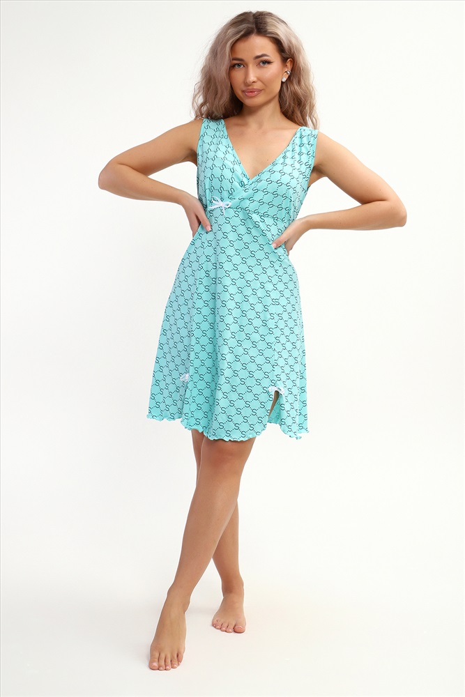Застежка: без застежки Сорочка с V образным вырезом. Полочка отрезная под грудью. Юбка с рельефами. Нашиты бантики. Подходит для беременных.