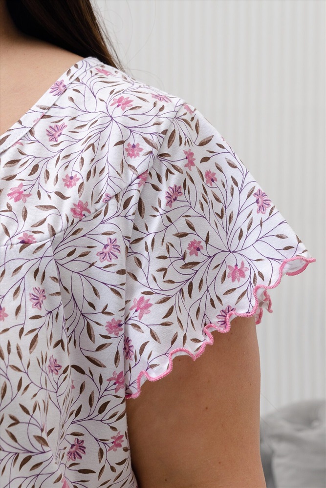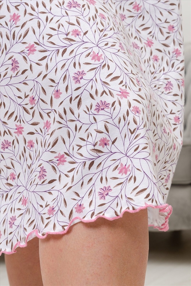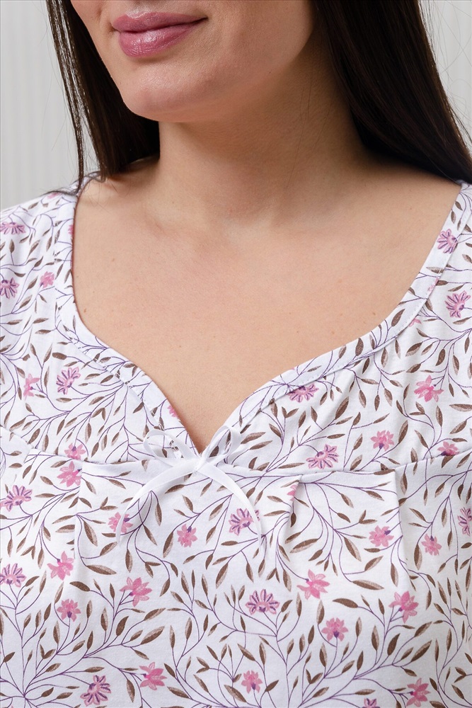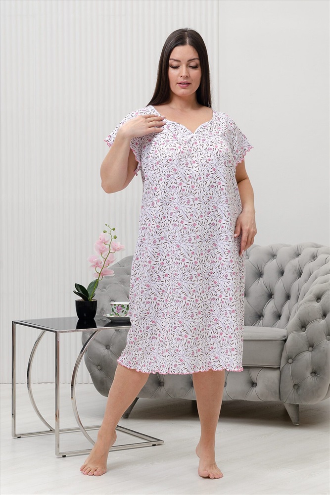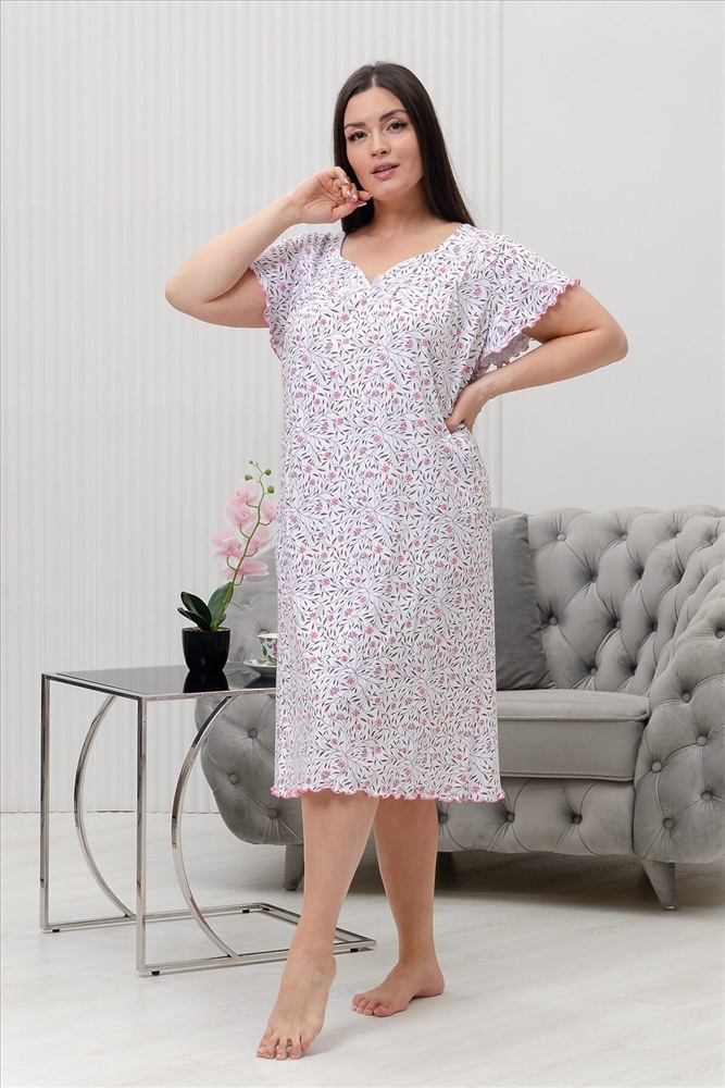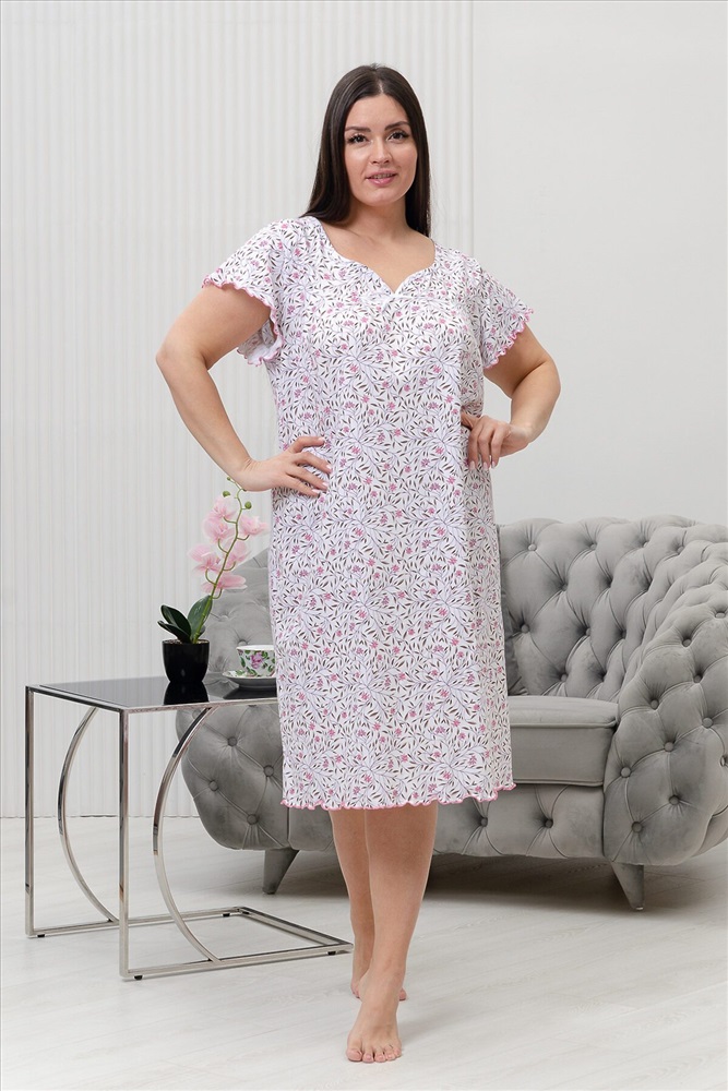 ID товара: 954624 Состав: 100% Хлопок Сезон: Демисезон Длина: Удлиненная Фасон: Прямой Рукав: короткие Основная ткань: Хлопок Стиль: Повседневный Вид ткани: Кулирка Страна бренда: Россия Страна производства: Россия Сорочка женская с коротким рукавом крылышком и фигурным вырезом над линией декольте. Комментарии к товару