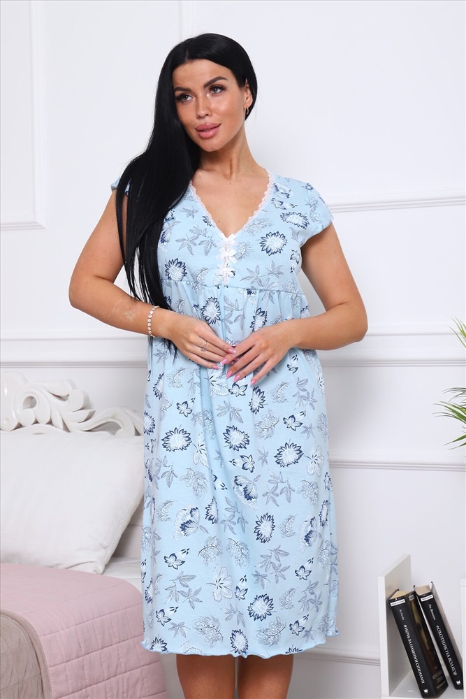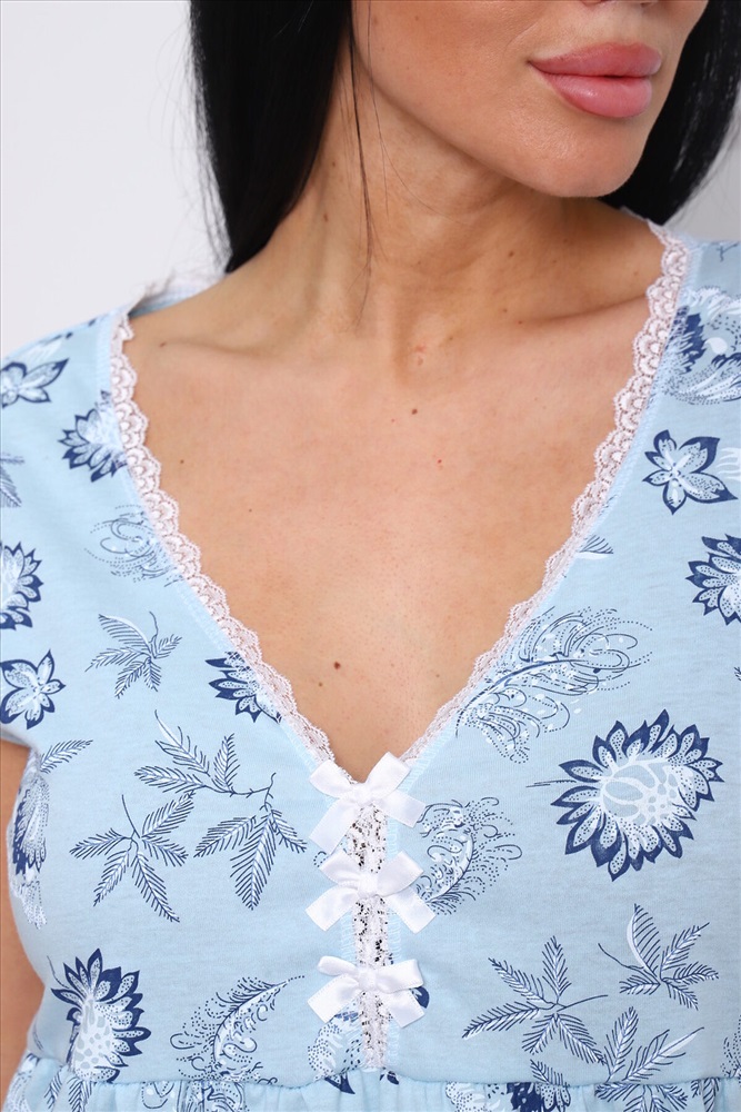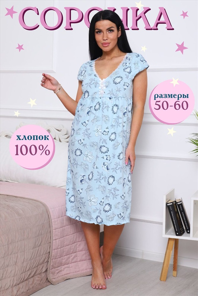 ID товара: 980525 Состав: 100% Хлопок Сезон: Весна/Лето Фасон: Свободный крой Рукав: Короткий Вырез горловины: V-образный Рисунок: Фантазийный Вид ткани: Кулирка Страна бренда: Россия Страна производства: Россия Сорочка женская из кулирного полотна. Комментарии к товару