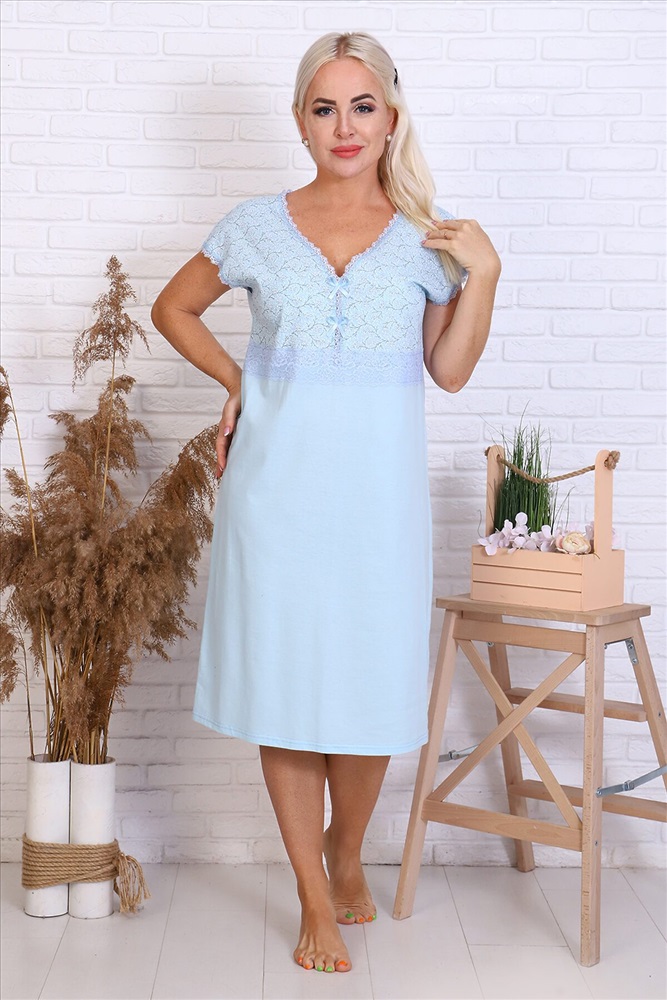 Сорочка женская из кулирного полотна, свободного кроя, горловина и линия проймы рукава обработаны кружевом, низ изделия обработан на плоскошовной машине.