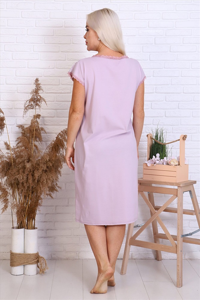 Сорочка женская из кулирного полотна, свободного кроя, горловина и линия проймы рукава обработаны кружевом, низ изделия обработан на плоскошовной машине.