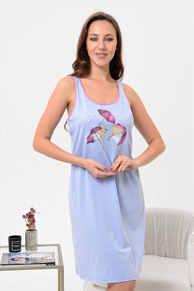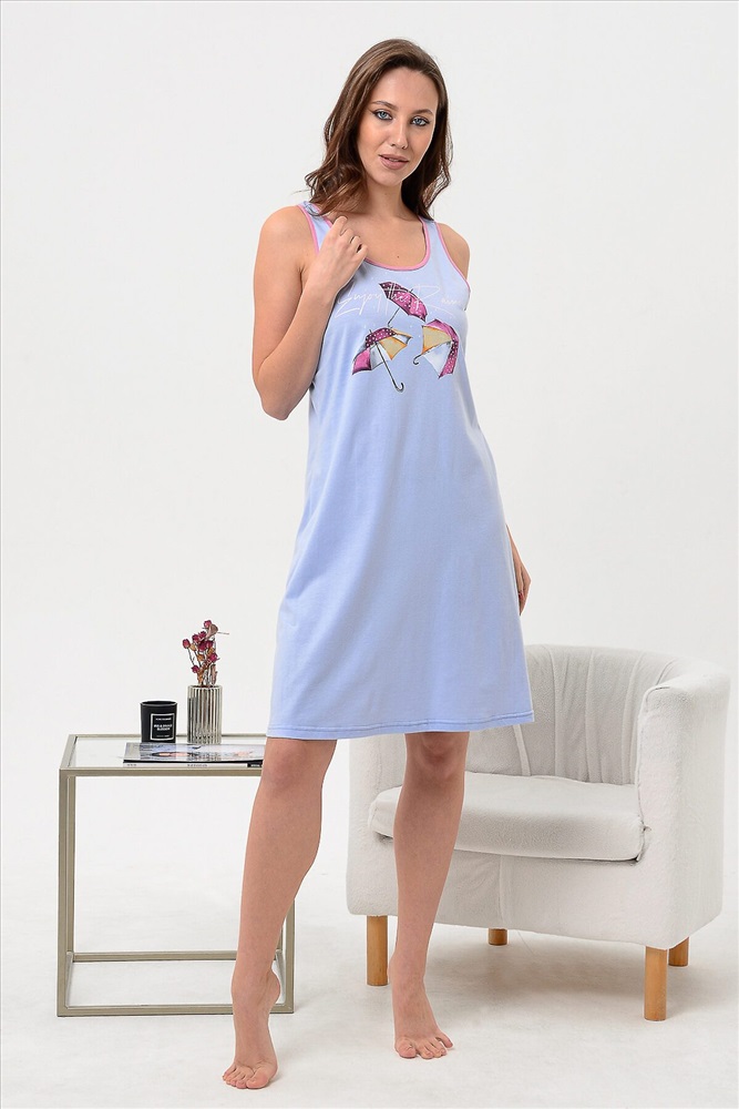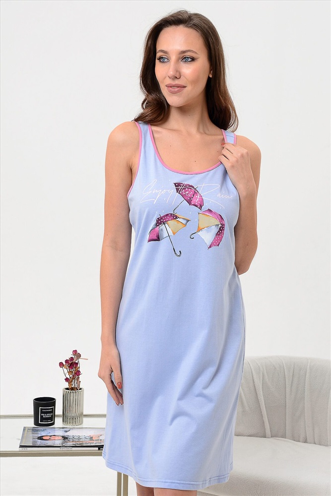 Сорочка из кулирного полотна 100% хлопок. Вырез горловины круглый, спина открытая на бретелях, низ подогнут на плоскошовной машине, на полочке принт. Сорочка удобна для сна, ваше тело будет дышать за счет натурального состава ткани. Легкая в уходе.