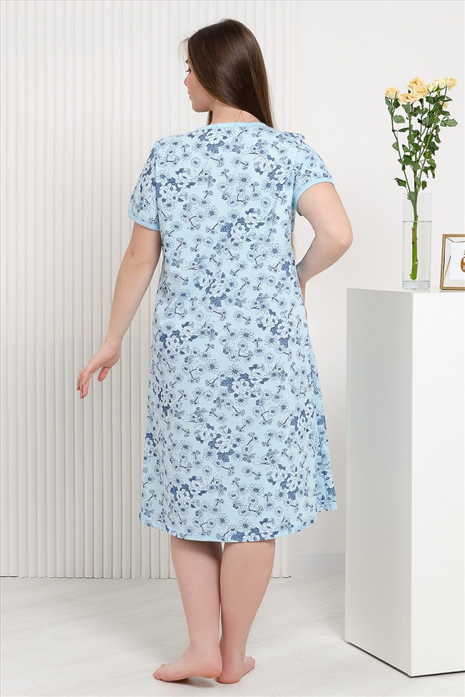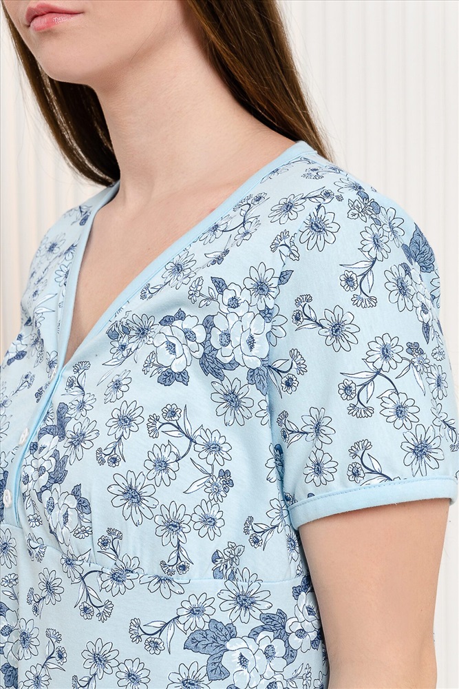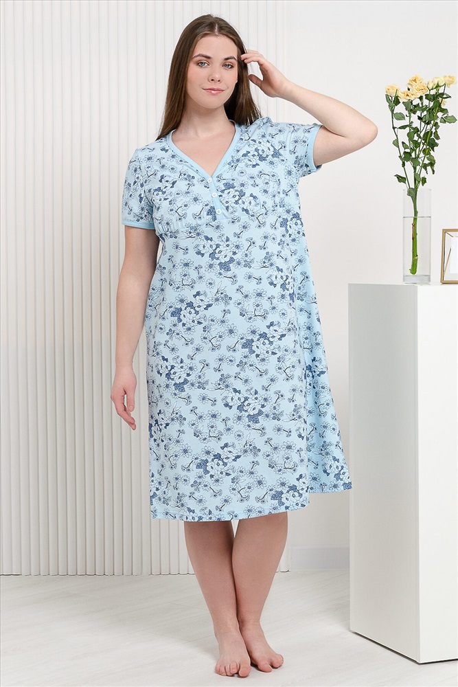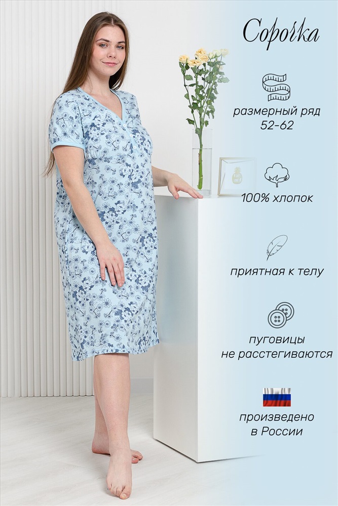 Сорочка женская из кулирного полотна, 100% хлопок. На полочке разрезная кокетка, горловина обработана окантовкой, на планке декоративные пуговицы, низ рукавов окантован, низ изделия обработан на плоскошовной машине. Сорочка удобна и комфортна для сна. Легкая в уходе.