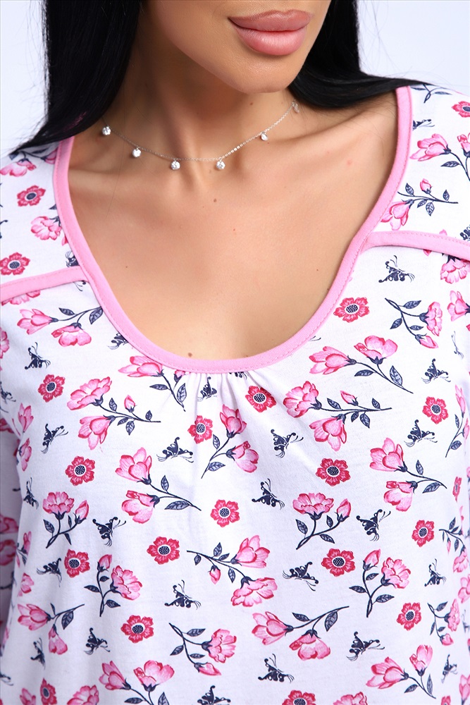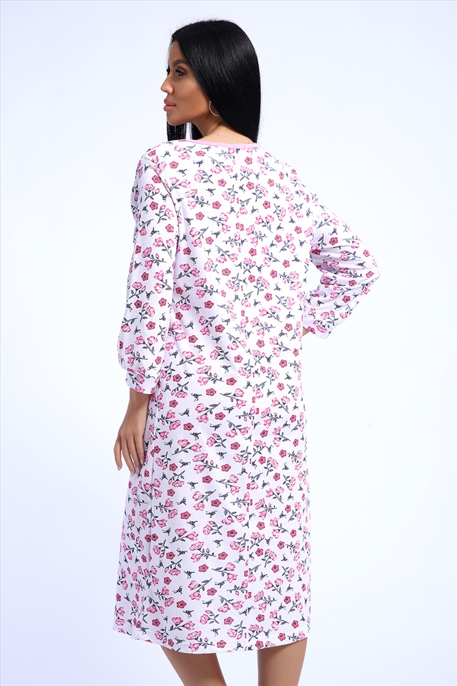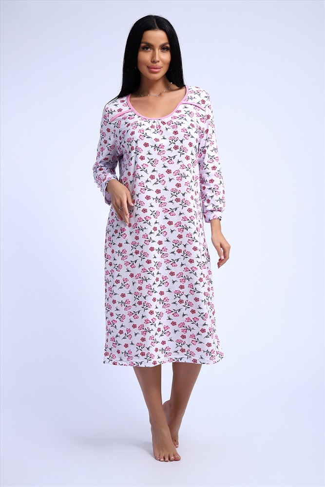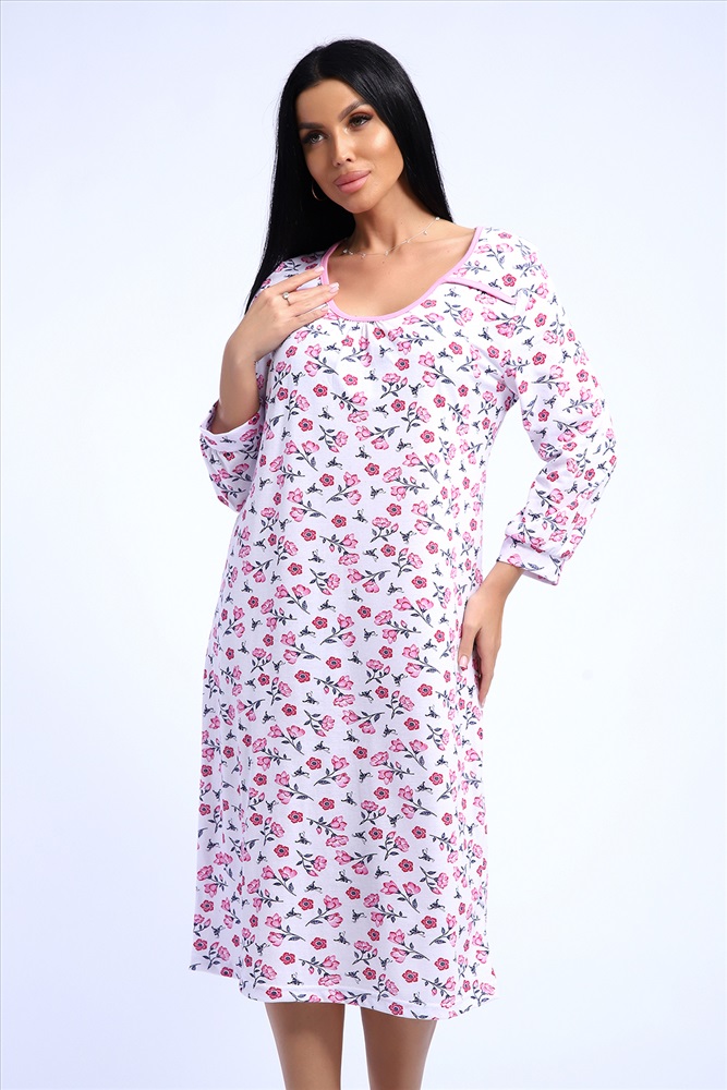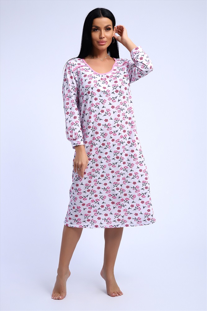 Стиль: домашний Сорочка из хлопковой белоземельной кулирки с нежным цветочным рисунком, рукава длинные.