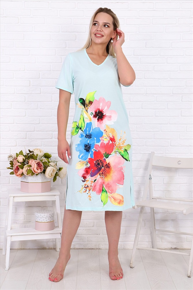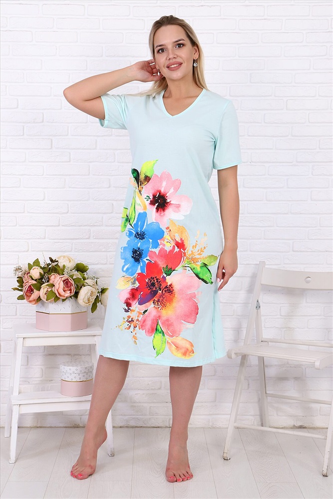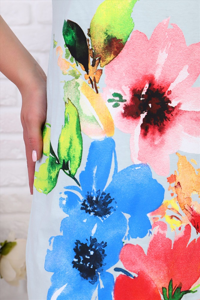 Страна производства: Россия Длинная сорочка из кулирки, V-образная горловина обработана кантом. Разрезы по бокам, короткие рукава, на полочке большой яркий принт в виде цветов