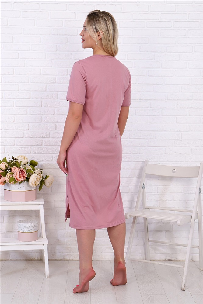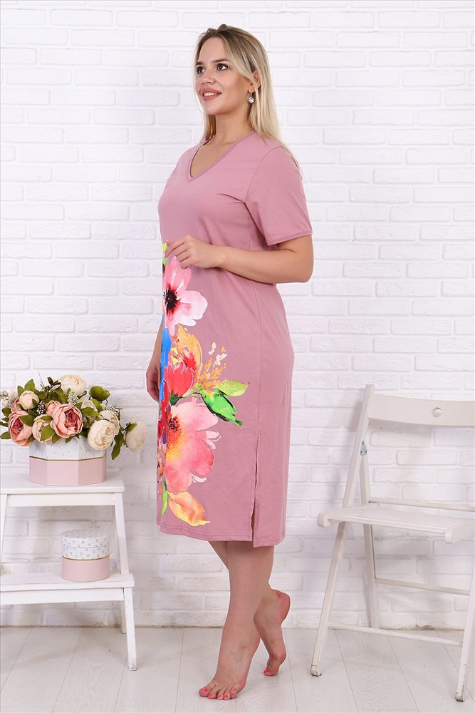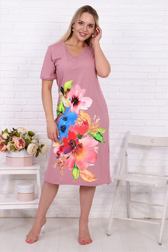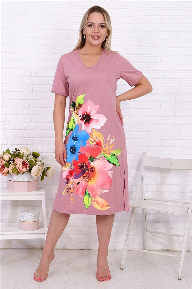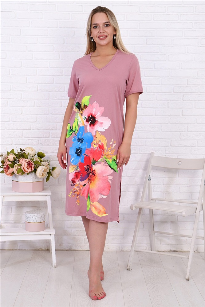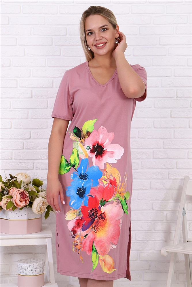 Страна производства: Россия Длинная сорочка из кулирки, V-образная горловина обработана кантом. Разрезы по бокам, короткие рукава, на полочке большой яркий принт в виде цветов