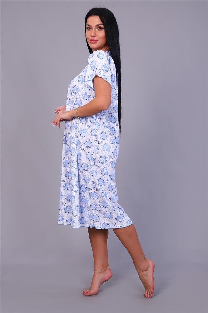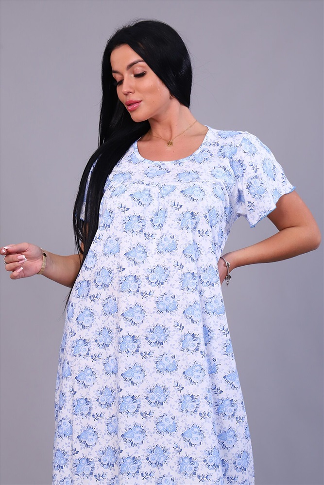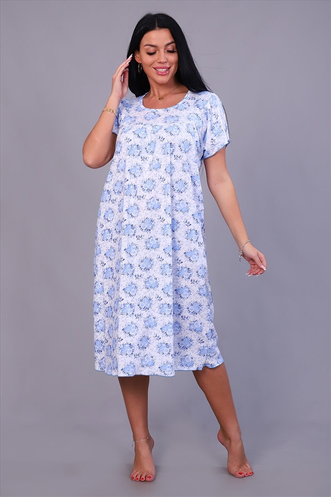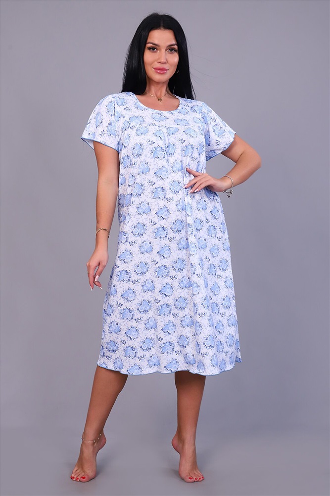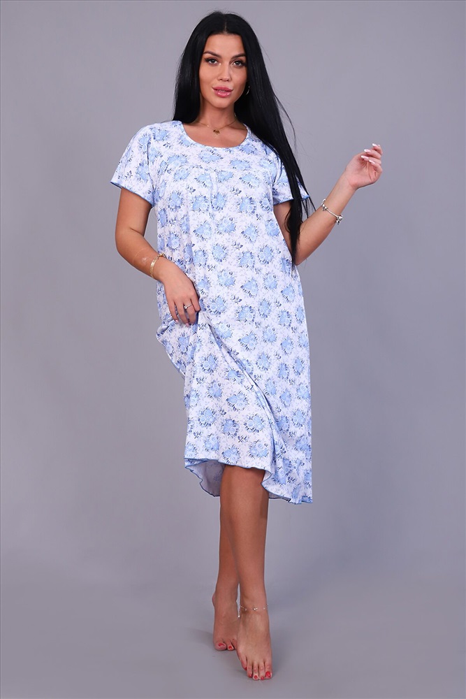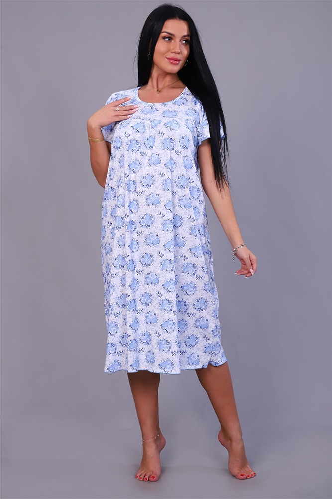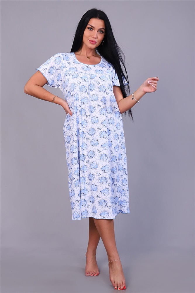 ID товара: 817099 Состав: Хлопок 100% Сезон: Демисезон Длина: Миди Фасон: Свободный крой Рукав: Короткие Декоративные элементы: Принт Основная ткань: Хлопок | Кулирка Стиль: Повседневный Страна бренда: Россия Страна производства: Россия Женская ночная сорочка, рукав крыло, по груди и спинке кокетка. Спинка со швом, длина до икры, обработана под краевку. Комментарии к товару