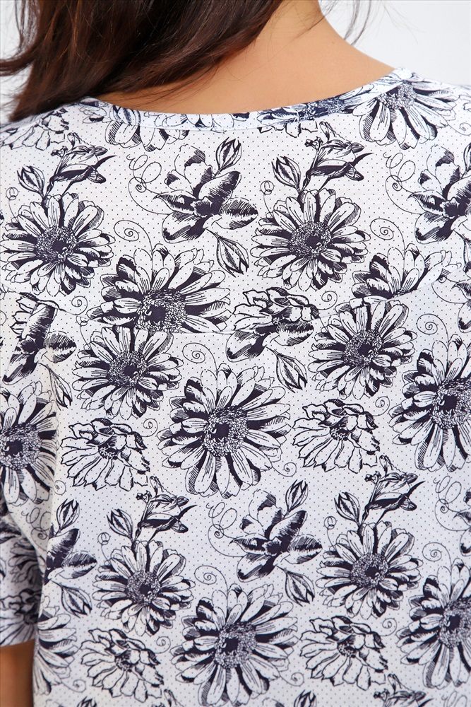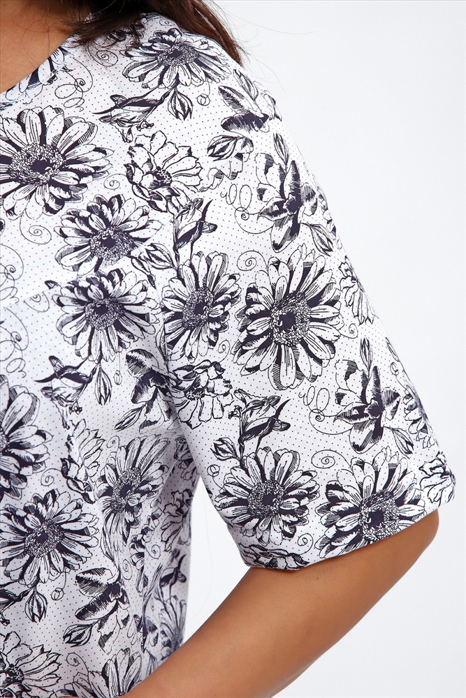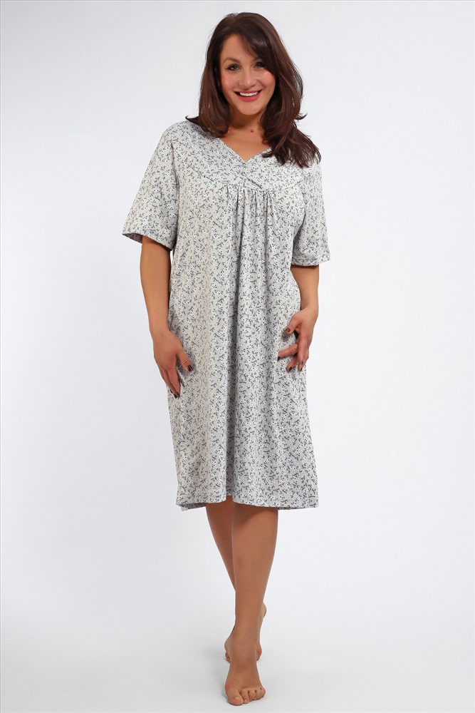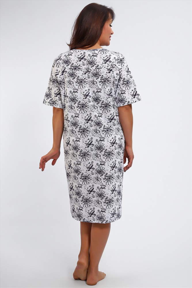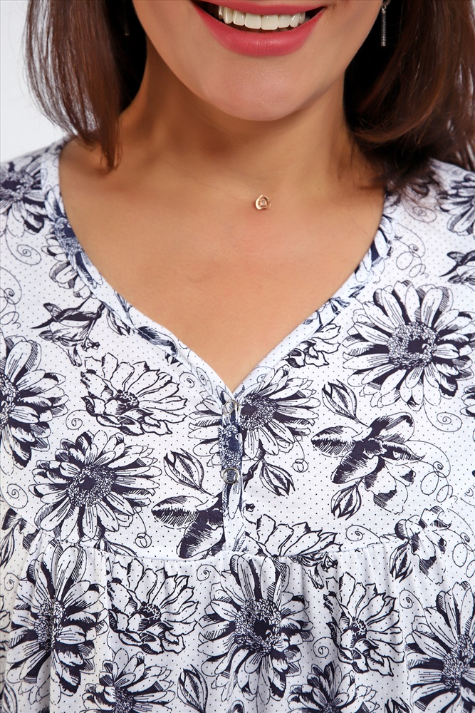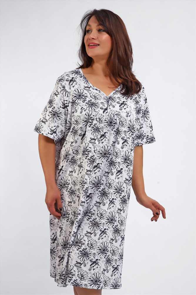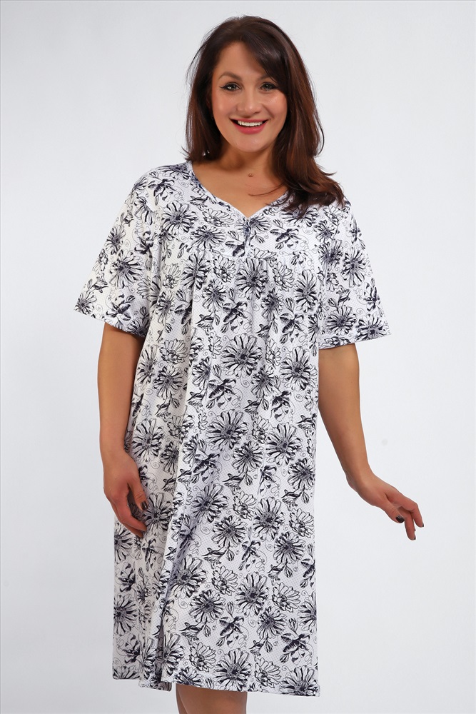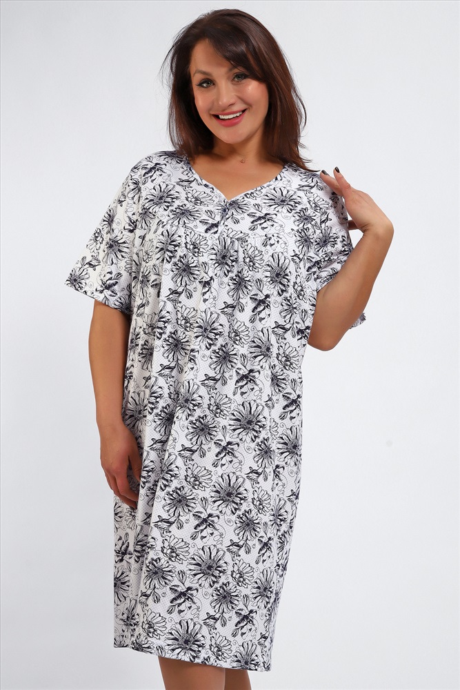 Состав: хлопок 100% Модель: Сорочка 88126 Тип товара: сорочка Материал: кулирка | кулирка Бренд: Натали Суслова Карман: без карманов Назначение: для дома НДС: Без НДС Рисунок: цветы Рукав: короткий рукав Сезонность: лето | осень | весна | зима Силуэт: свободный Стиль: домашний Воротник: без воротника Застежка: пуговицы Сорочка женская с рукавом и кнопками. Данная модель выполнена из трикотажного полотна кулирка ( хлопок 100%). У данной модели полоска и спинка отрезная . Свободного покроя, не стесняет движения. Таблица размеров и веса