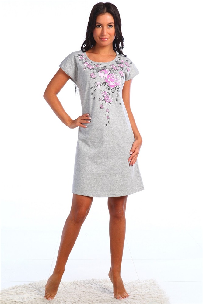 Сорочка из кулирки. Короткие рукава, принт в виде цветов. Два варианта расцветки — ментоловая и серая. Общая длина чуть выше коленей. ментол - 100% хлопок; серый меланж - 70% хлопок, 30% п/э