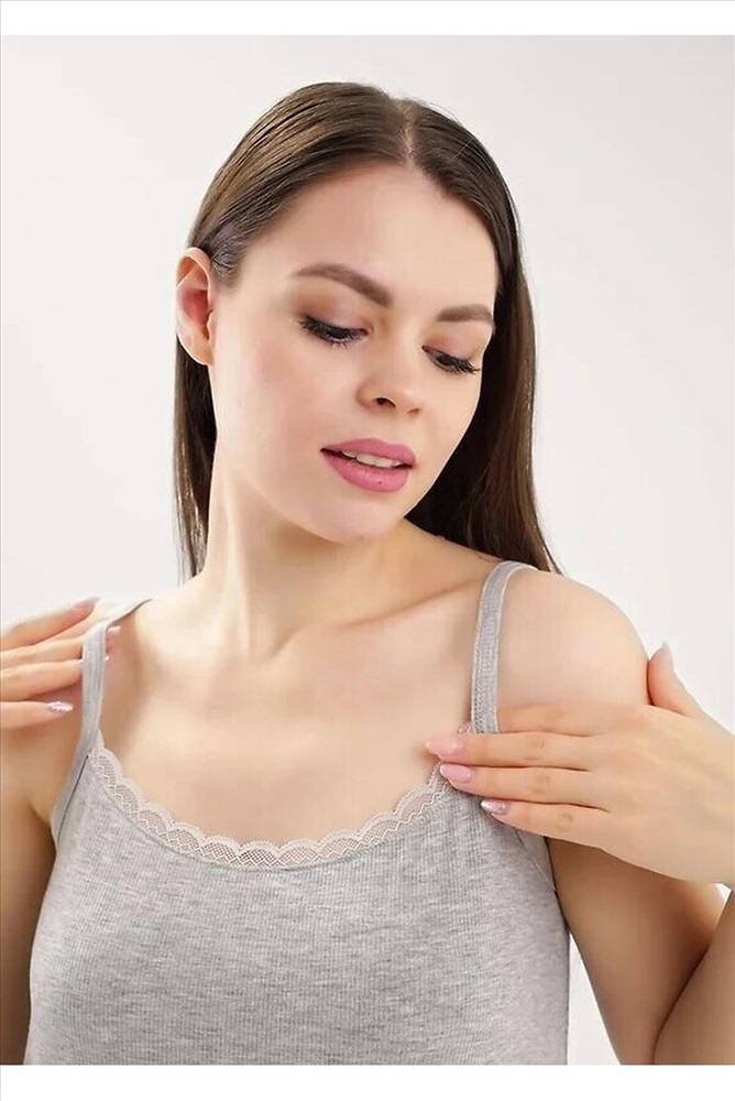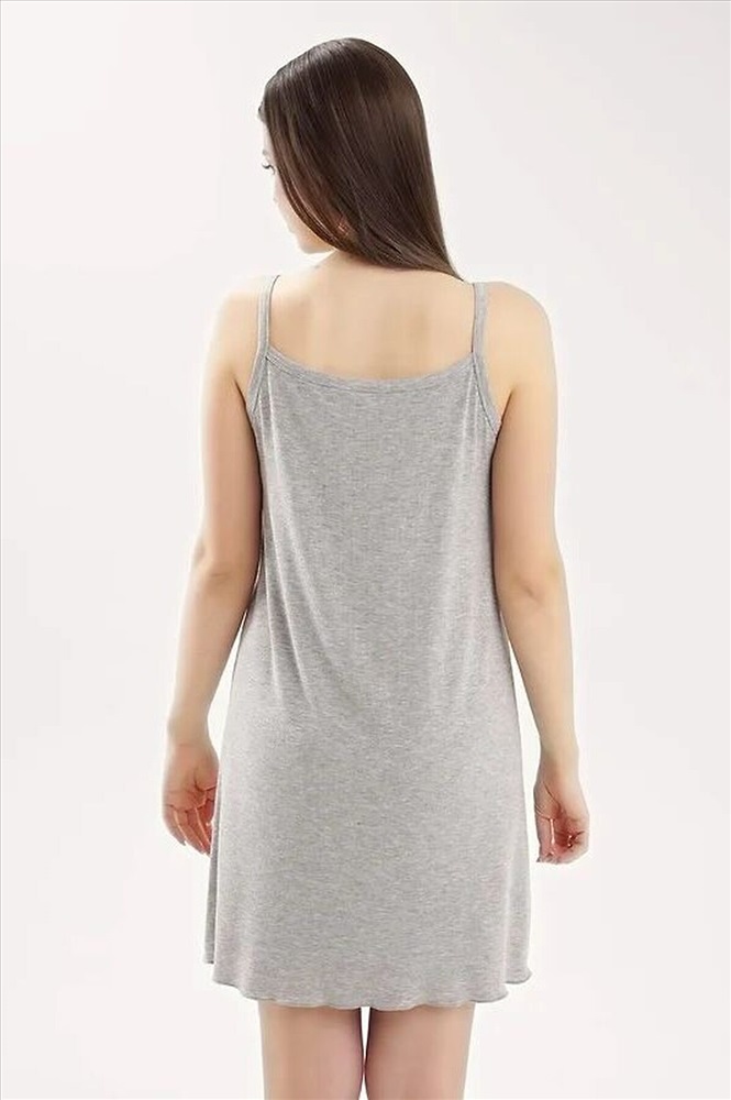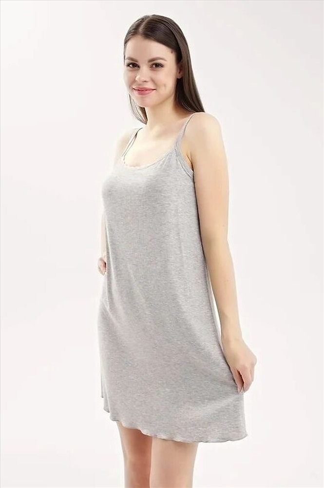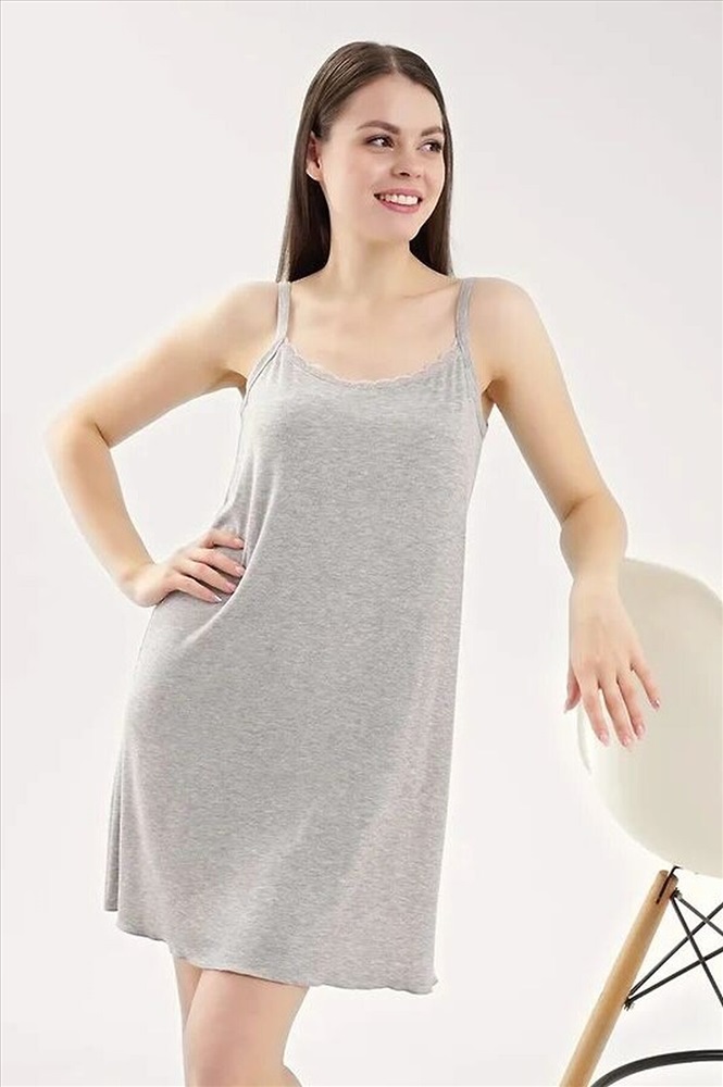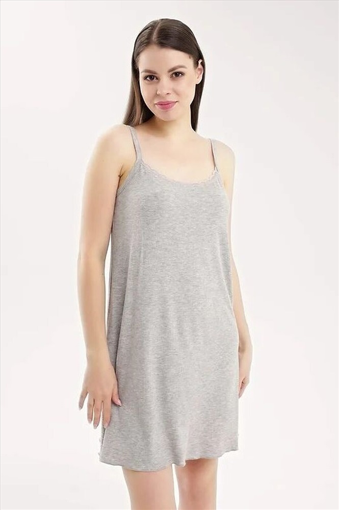 Ночная сорочка для дома и отдыха из вискозного трикотажного полотна кашкорсе лапша. А-образного силуэта длиной чуть ниже колена, на узких бретелях. Спереди по горловине кружево, по спинке окантовка. По низу изделия узкий оверлок.
