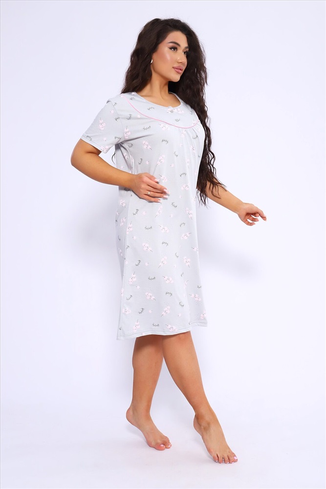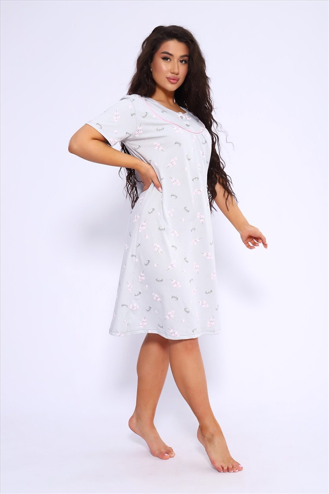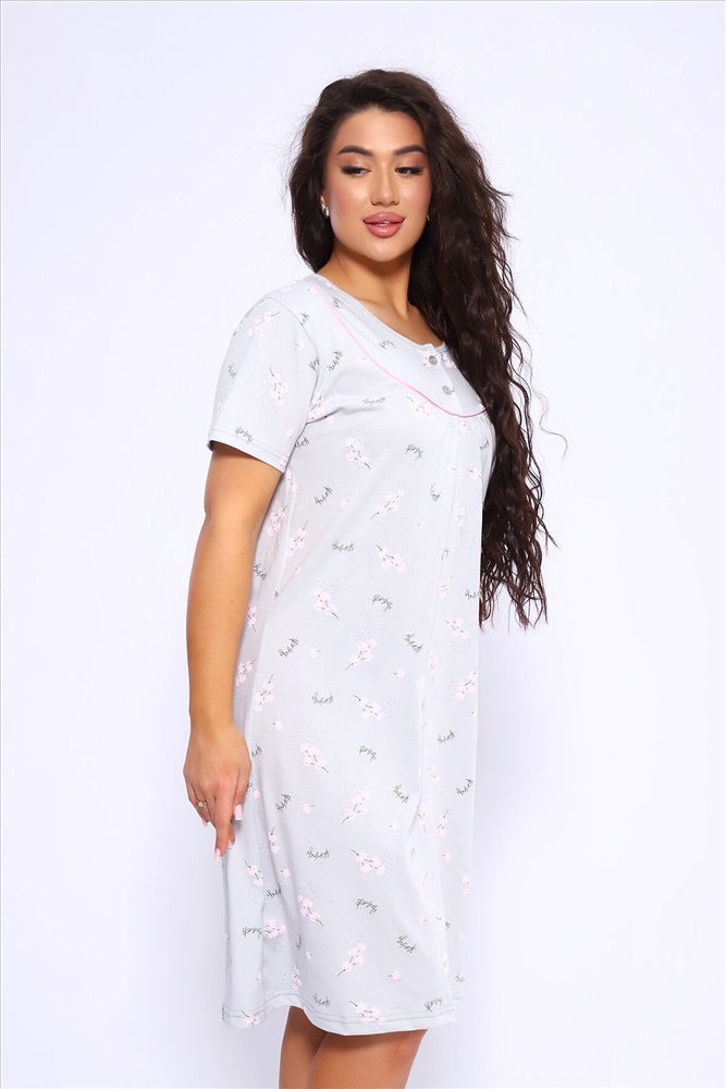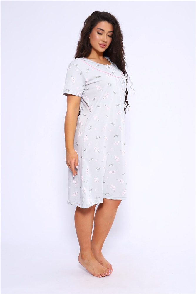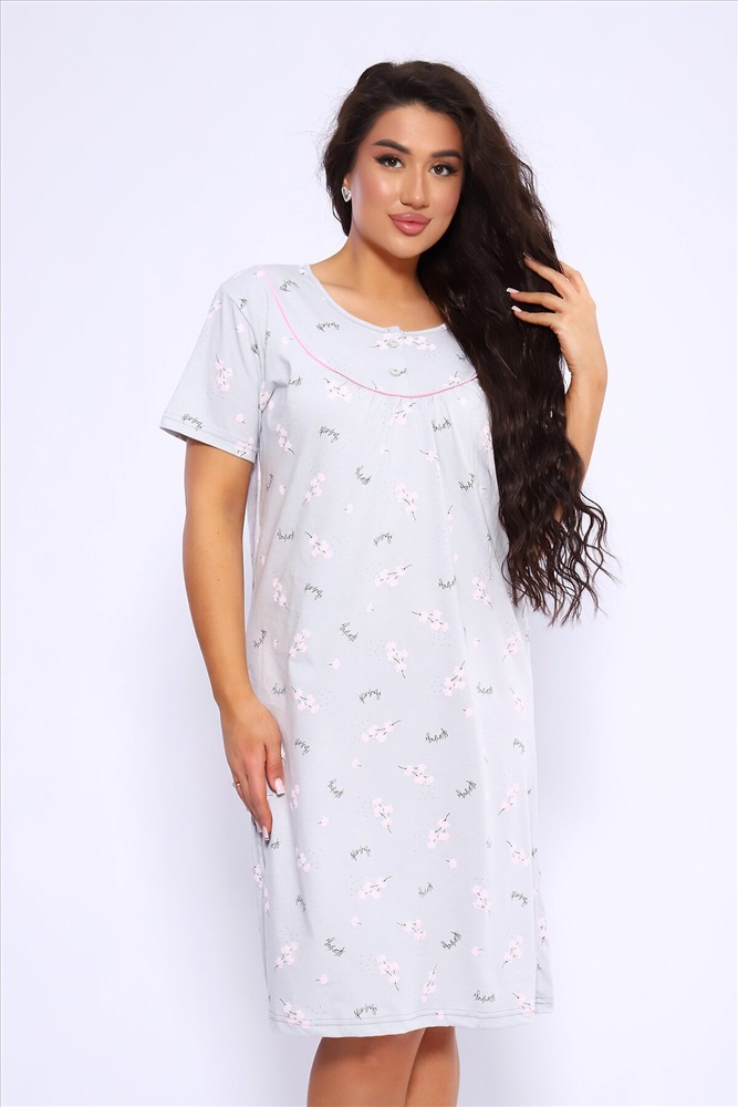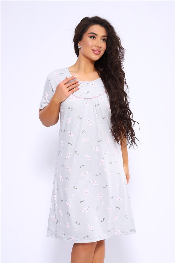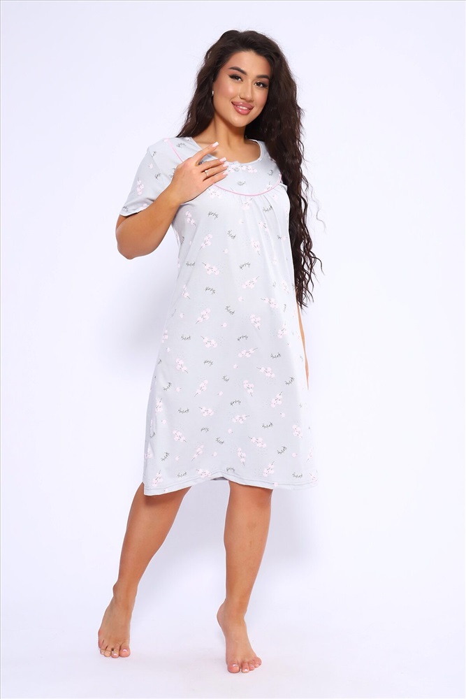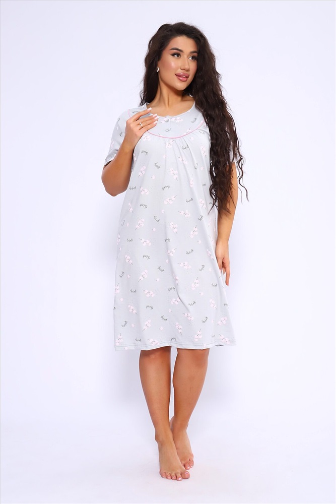 ID товара: 1022140 Состав: 100% Хлопок Сезон: Демисезон Длина: Ниже колена Фасон: Полуприлегающий Рукав: короткие Декоративные элементы: Принт Основная ткань: Хлопок Вид ткани: Кулирка Страна бренда: Россия Страна производства: Россия Сорочка женская полуприлигающего силуэта с коротким рукавом. Кокетка с кантом, украшена двумя пуговками Комментарии к товару