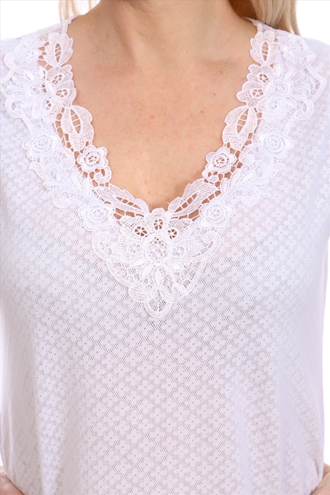 Стиль: домашний Изделие выполнено из лёгкой ажурной кулирки с гипюром. Ткань очень приятная к телу. Горловина украшена большой кружевной вставкой. Благодаря наличию в составе небольшого количества полиэстера, изделие не деформируется после стирки. Ажурный рисунок может быть разный (кружочки, цветы, сердечки, и т.д.)