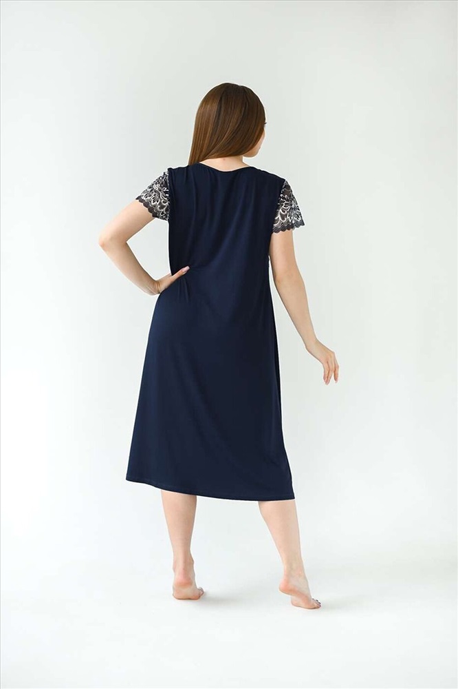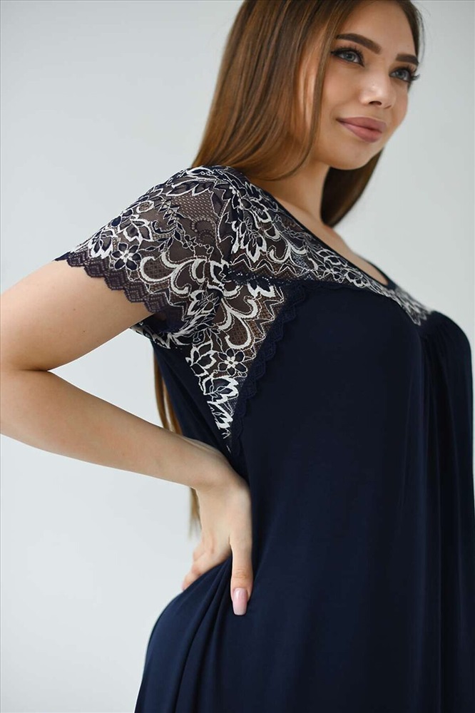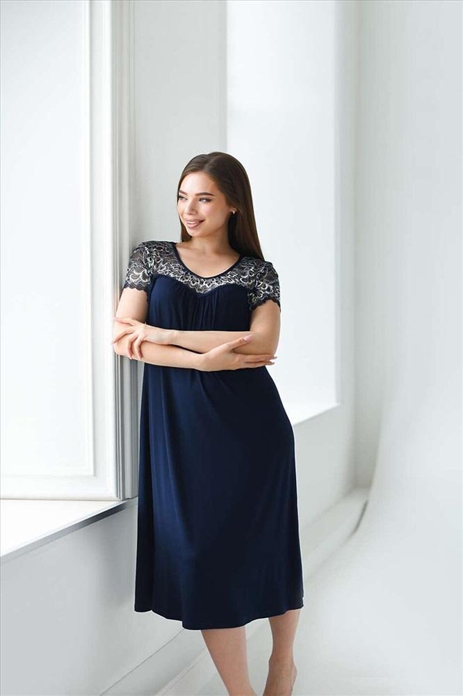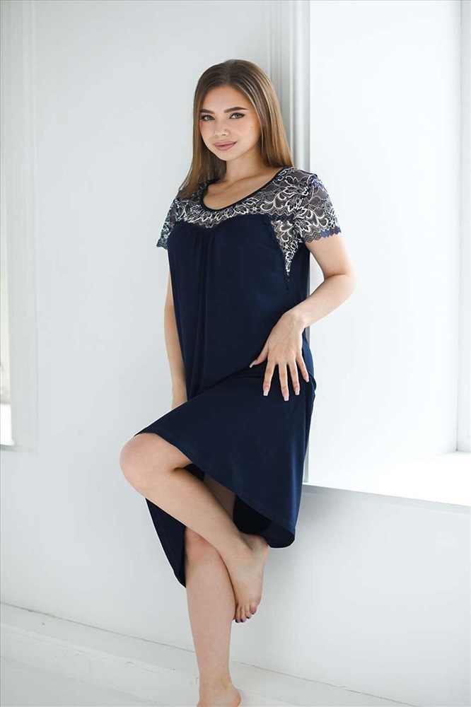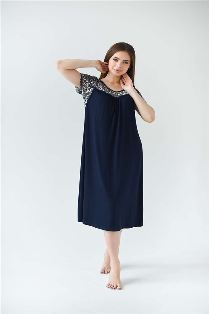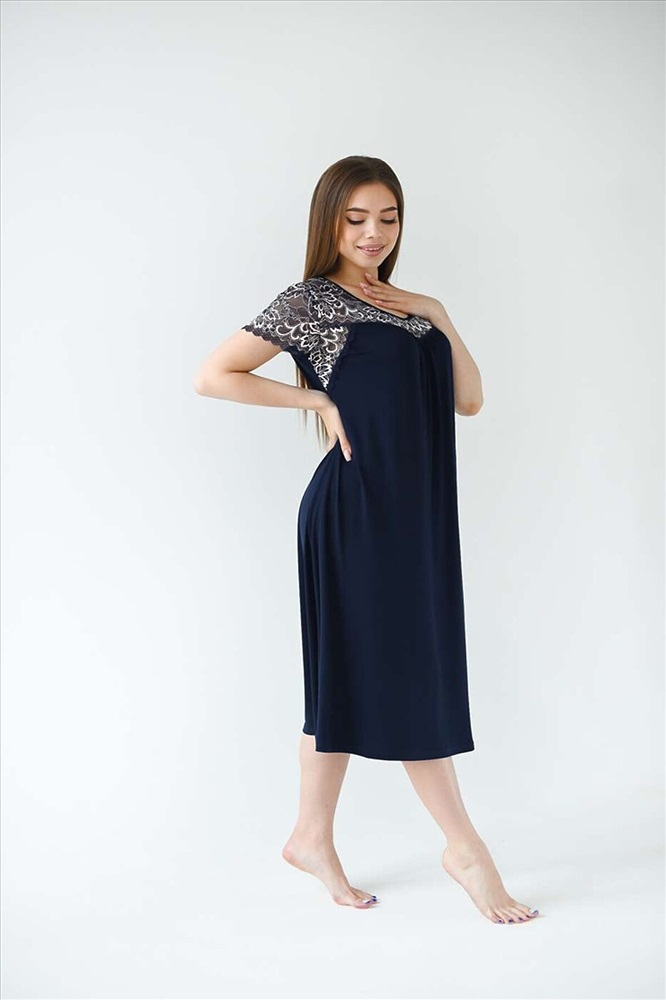 Сорочка трапецевидного силуэта, длиной за колено, с кружевным рукавом. По переду и горловине сорочка декорирована эластичным кружевом. В области груди расположена эффектная сборка.