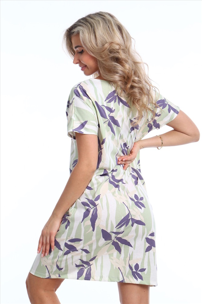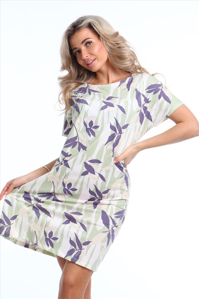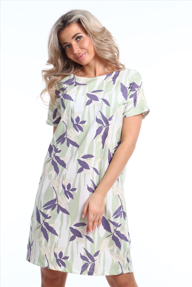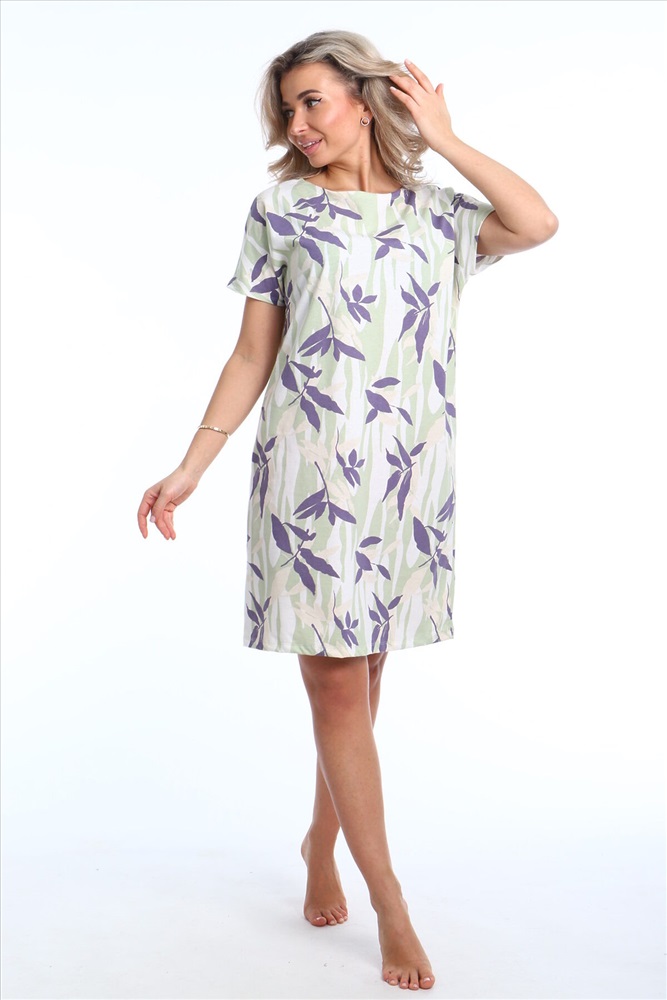 Страна производства: Россия Предлагаем вам женскую сорочку из комфортного трикотажного полотна кулирка с элегантным набивным рисунком. Стильная модель с прямым силуэтом, короткими рукавами и овальной горловиной и прямой линией низа. Наслаждайтесь комфортом и изяществом в одежде!