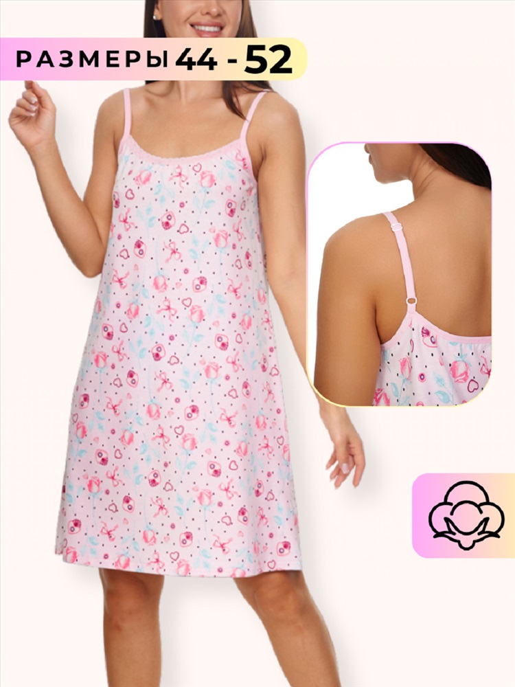 Стиль: домашний Сорочка женская выполнена из приятного хлопкового трикотажного полотна с милым цветочным рисунком. Сорочка свободного кроя и оптимальной длины. Бретели выполнены из эластичной плоской резинки с регулятором длинны, что добавляет комфорта при носке сорочки, так как позволяет регулировать длинну бретели, не оказывая давления на тело. По полочке выполнено нежное кружево. Сборка по полочке дает дополнительный объем в области груди, не стесняя в движений.