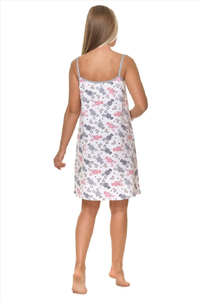 Сорочка женская выполнена из хлопкового трикотажного полотна, с набивным милым рисунком - зайчата. Сорочка свободного кроя и оптимальной длины. Бретели выполнены из эластичных лент, что добавляет комфорта при носке сорочки, так как позволяют растягиваться, не оказывая давления на тело. По полочке выполнено нежное кружево. Сборка по полочке дает дополнительный объем в области груди, не стесняя в движении.