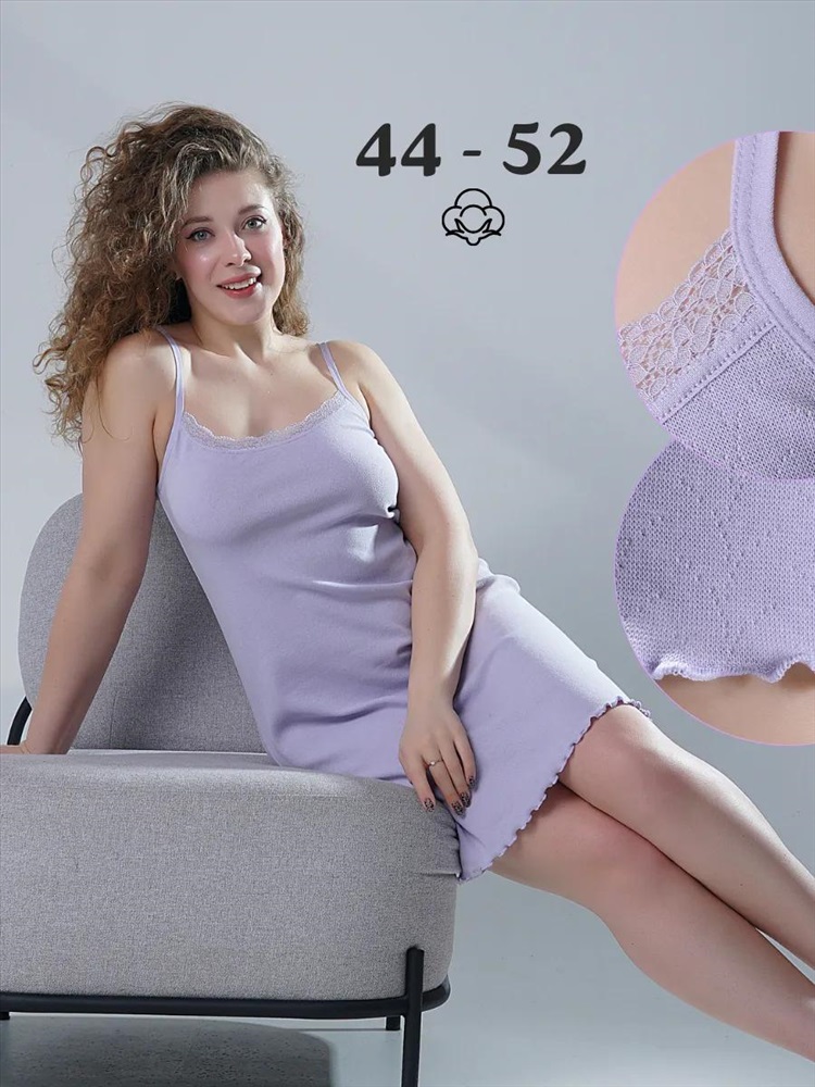 Стиль: домашний Ночная сорочка на тонких бретелях для сна не стесняет движений и доставляет максимальный комфорт и удобство. Бретельки из эластичной мягкой резинки с регулировкой длины, уютный хлопковый трикотаж высокого качества, отделка мягким кружевом по линии декольте. Пастельный оттенок и утонченный перфорированный рисунок на ткани создают нежный образ. Свободная модель средней длины миди подходит девушкам и женщинам любого возраста. Будем рады, если Вы оставите отзыв и поделитесь своим впечатлением о покупке!