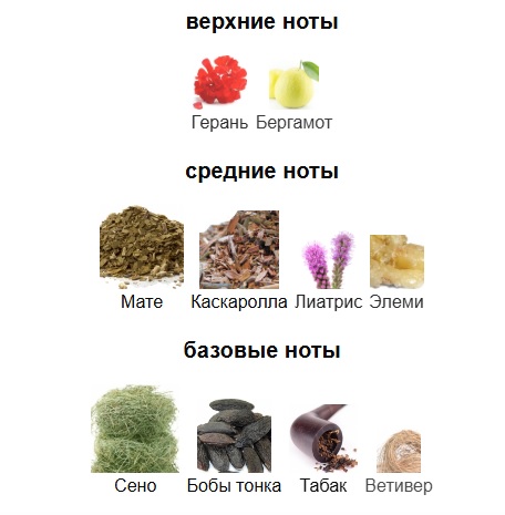Верхние ноты: Герань и Бергамот; средние ноты: Мате, Каскаролла, Лиатрис и Элеми; базовые ноты: Сено, Бобы тонка, Табак и Ветивер.