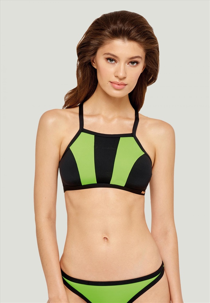 Топ с мягкими вшитыми чашками. Под грудью поддерживающая резинка. Контрастные вставки по центру передней детали. На спинке вставки из эластичного сетчатого полотна.