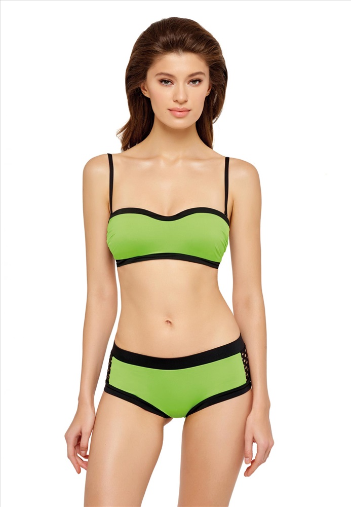 Вшитая мягкая чашка «бандо». Спинка из эластичного сетчатого полотна. Контрастная окантовка. Силиконовая лента по внутреннему краю.