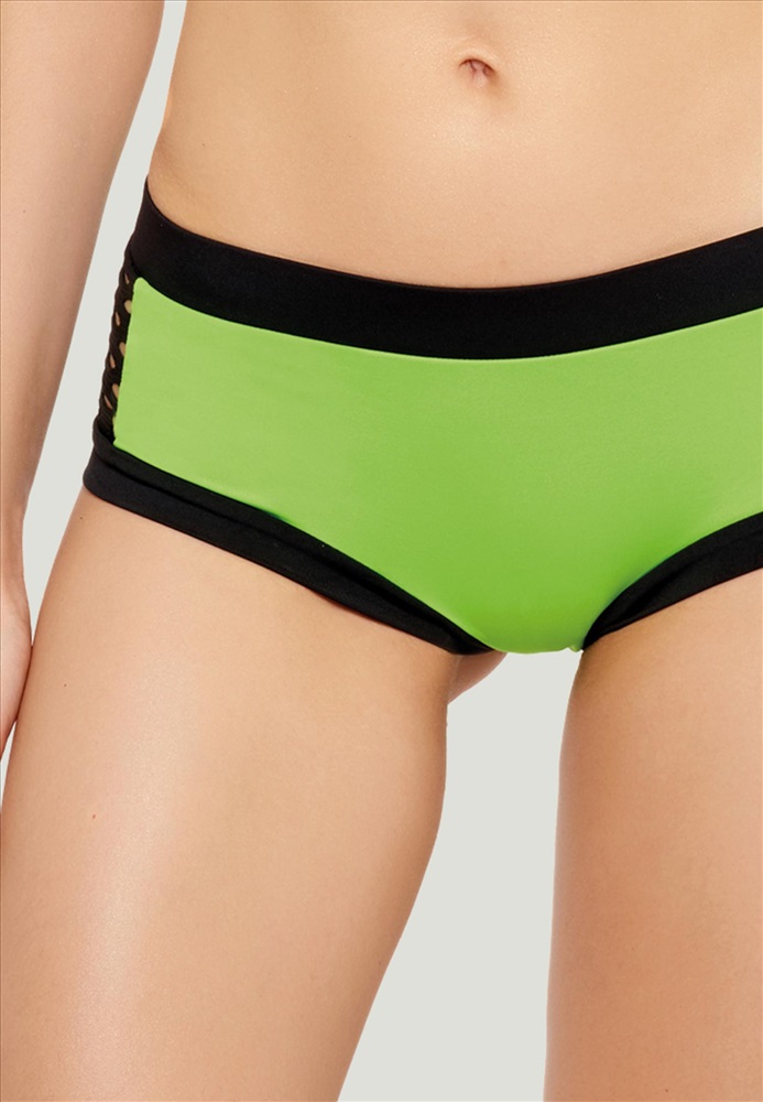 Спортивные шорты со средней линией талии. По бокам симметричные вставки из эластичного сетчатого полотна. Контрастная окантовка.