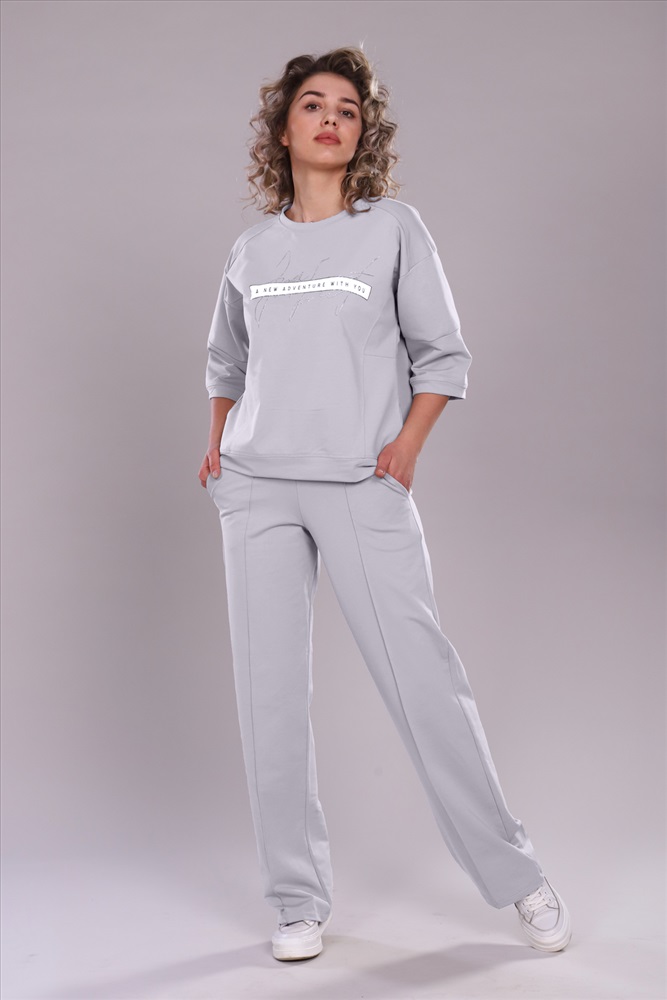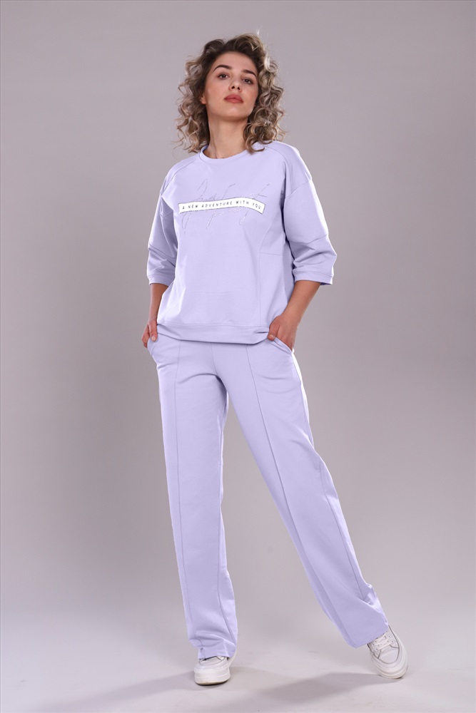 Застежка: без застежки Костюм женский с широкими брюками и свободной кофтой с рукавами 3/4. Модель выполнена из футера 2-х нитки (петля - хлопок).