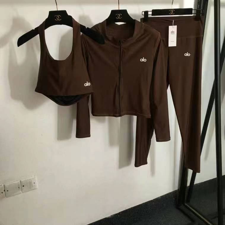спортивный костюм-тройка Alo, топ на молнии с длинными рукавами + жилет с бретельками + эластичные утягивающие леггинсы, цвет кофе, черный, S-XL, [размер M; обхват груди 72, длина обхвата плеч 36; обхват груди 36; 78, длина рукава 54, длина 46; талия 64, резинка, длина 90]